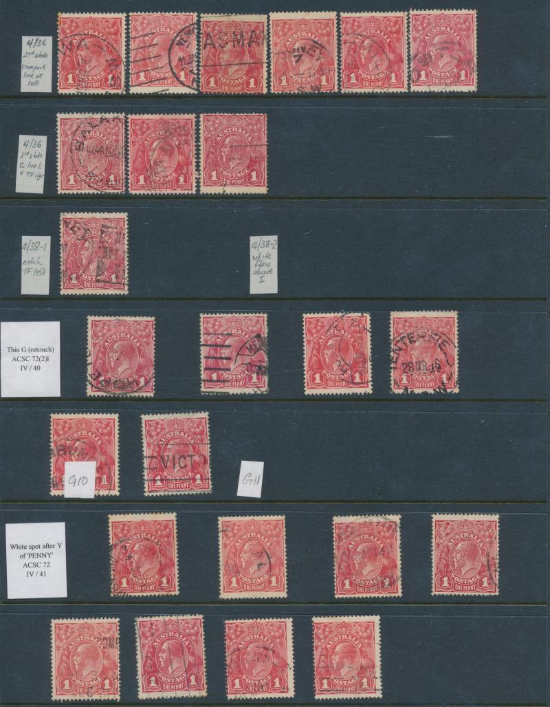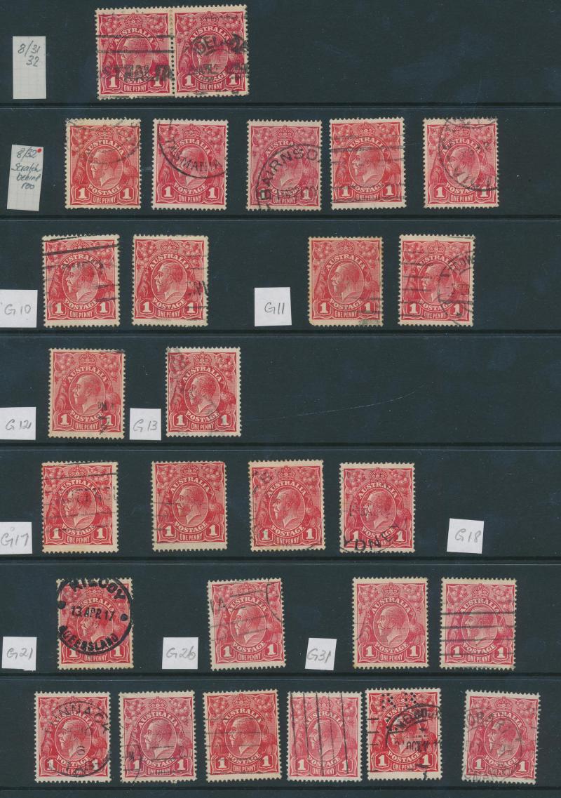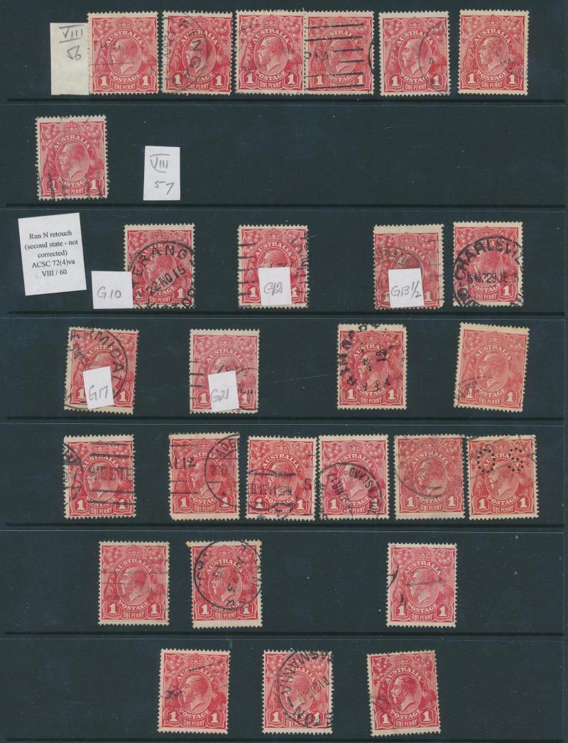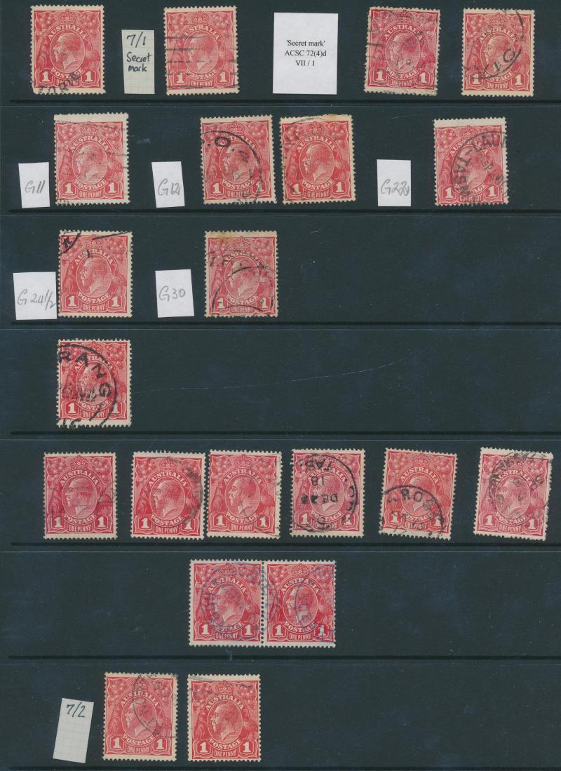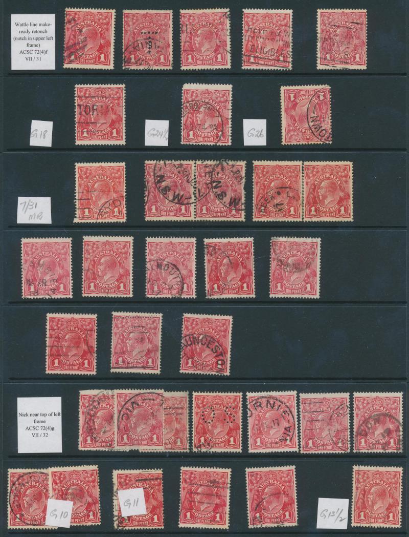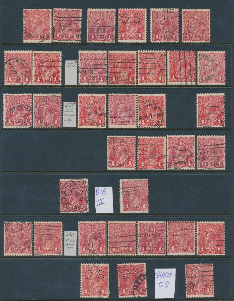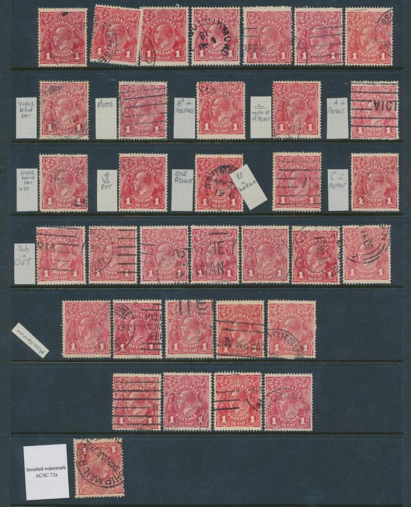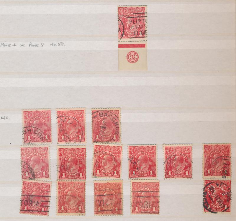 replaced it, No Wmk Obliterated 'AL' of 'HALFPENNY', etc, also a detailed study of Electro 13 & 14 Worn Upper Frames, also lots of other multiples, Federal & State Government punctures, and unplated examples many with dated cancels & potential