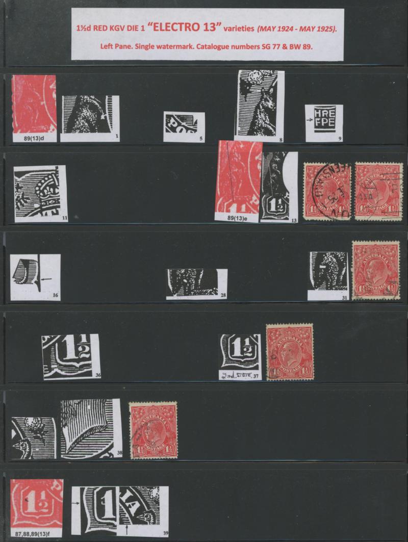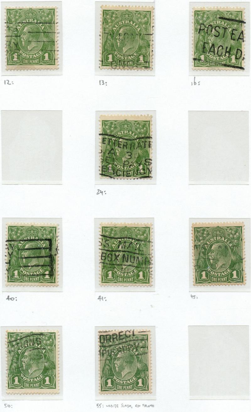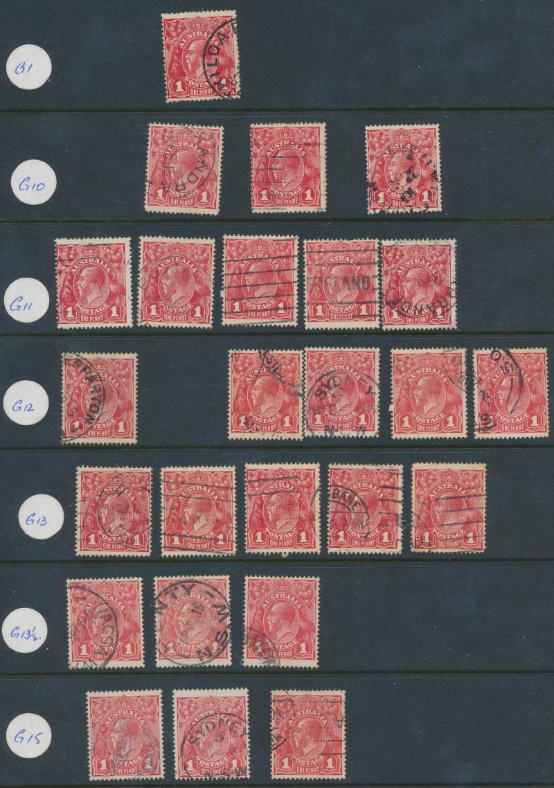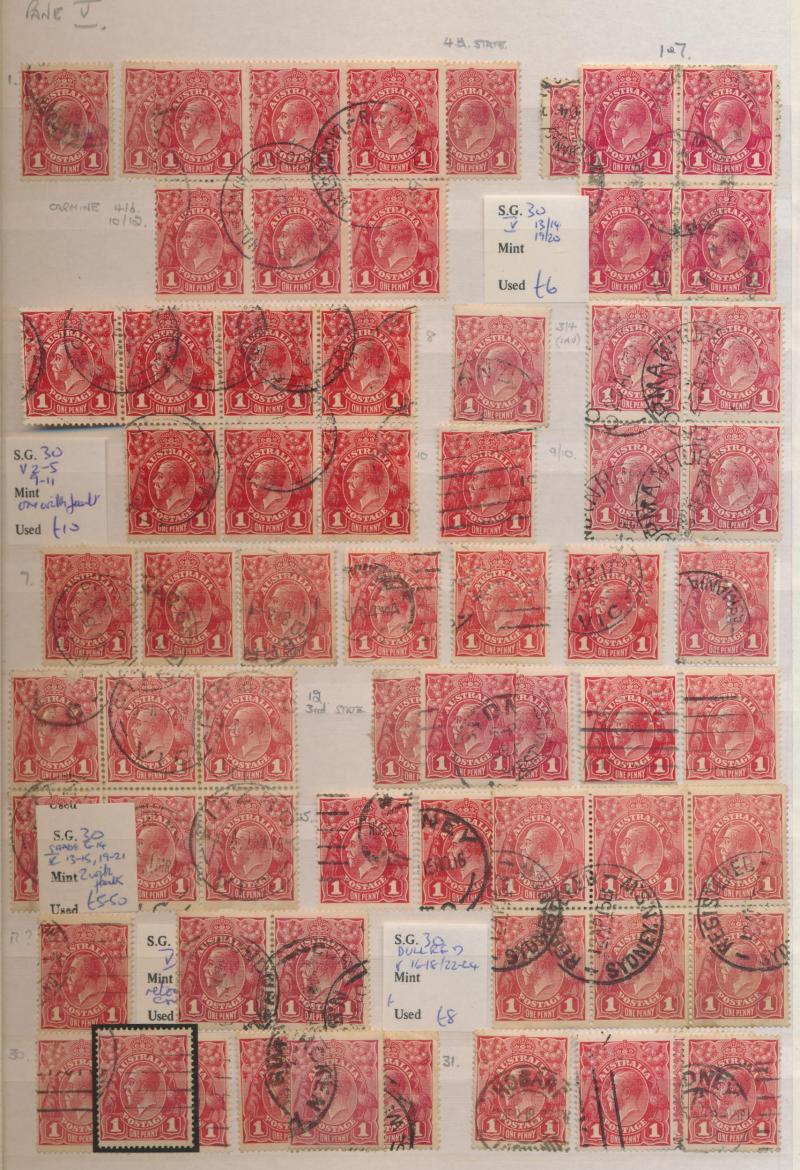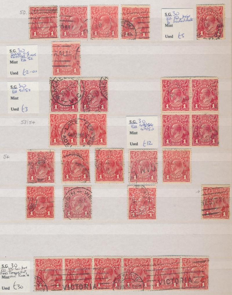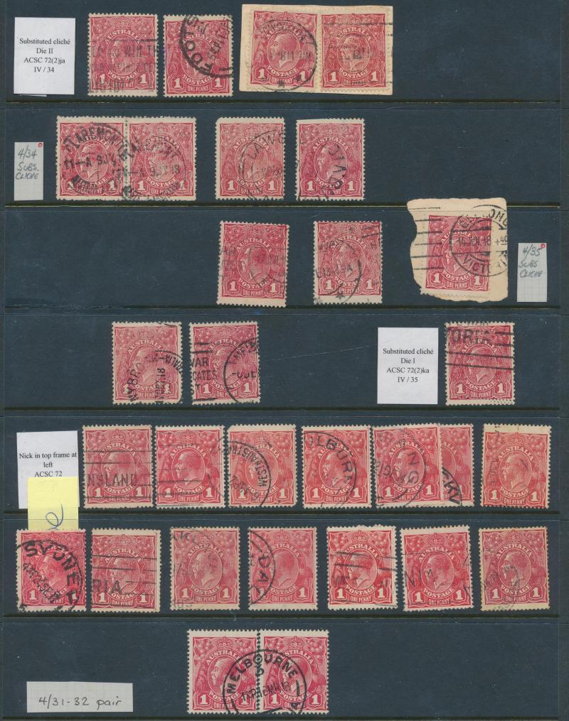 replaced it, No Wmk Obliterated 'AL' of 'HALFPENNY', etc, also a detailed study of Electro 13 & 14 Worn Upper Frames, also lots of other multiples, Federal & State Government punctures, and unplated examples many with dated cancels & potential