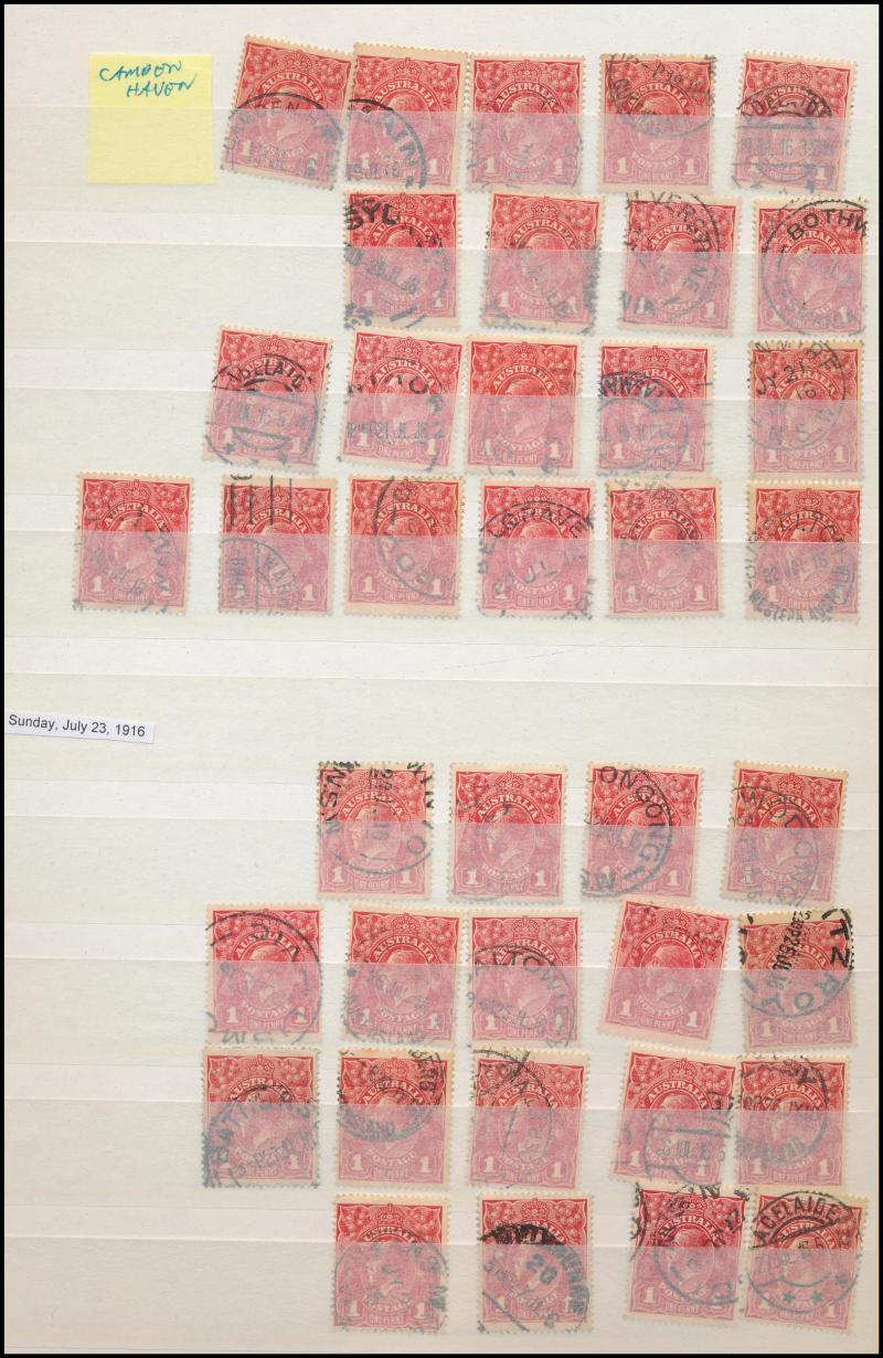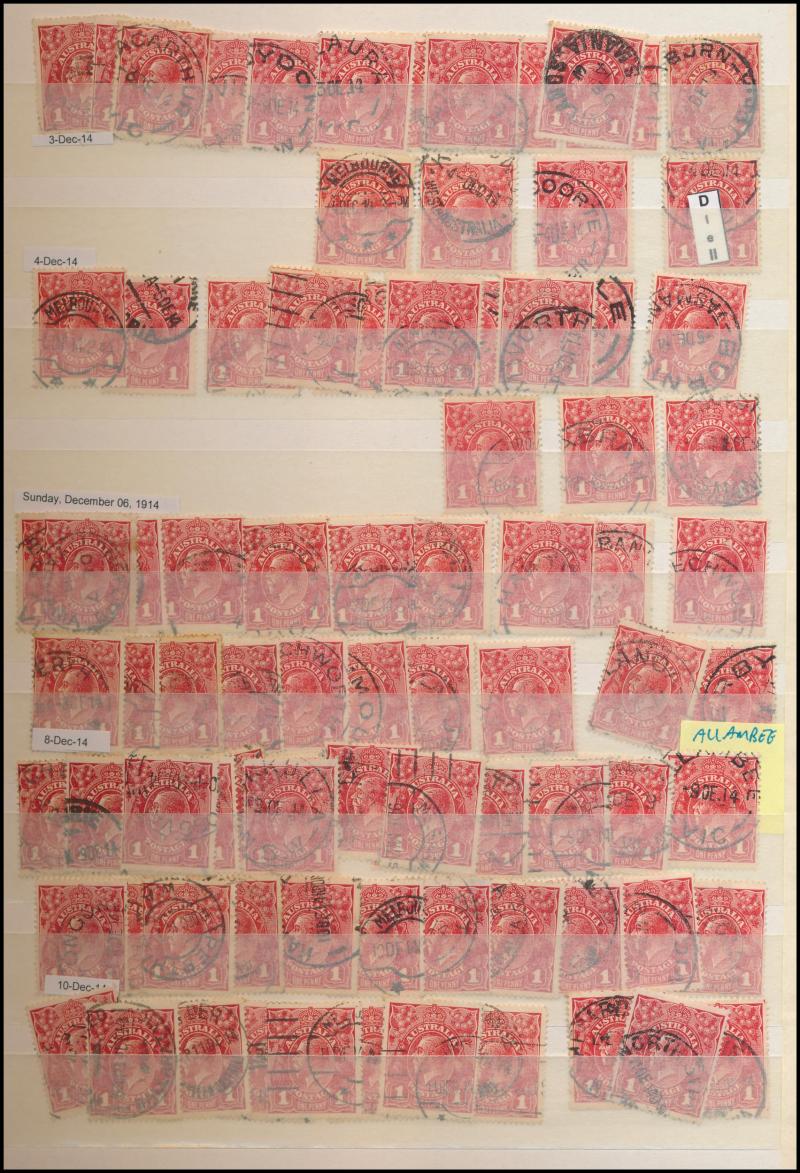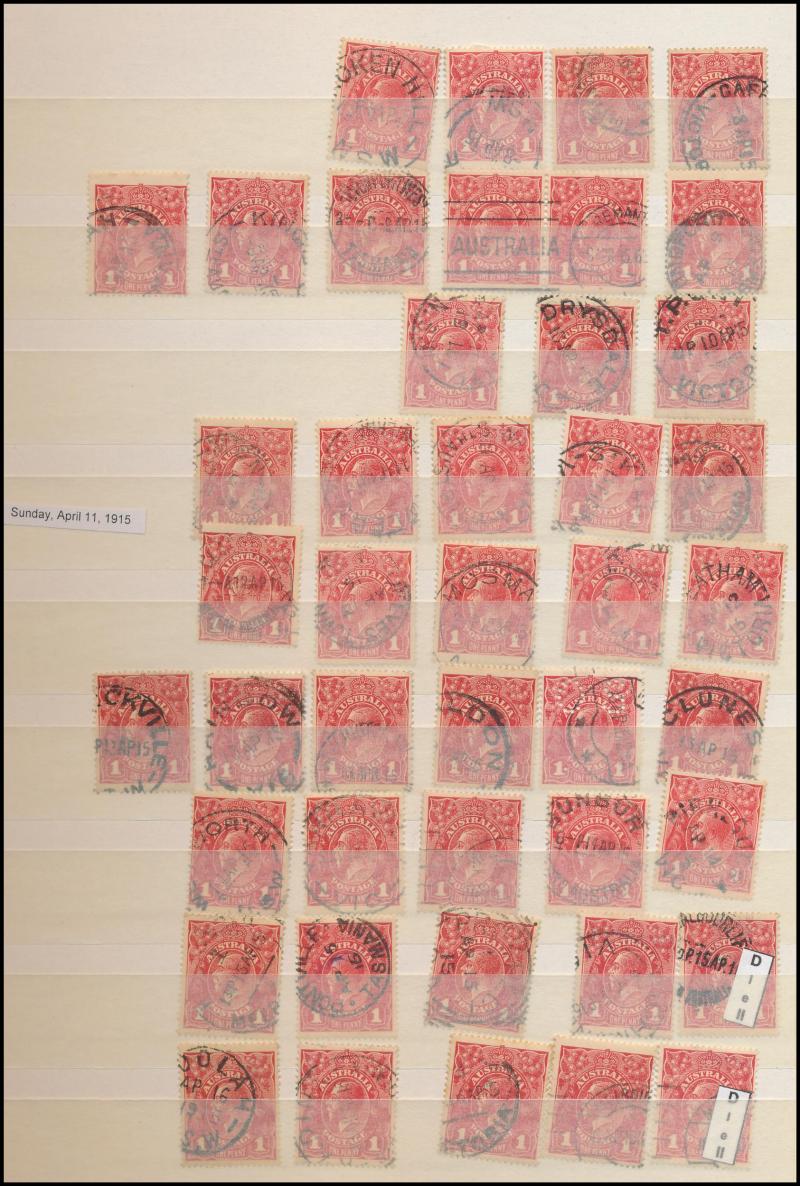 ONE PENNY: 1d red dated cancels collection in four 64-page stockbooks from 1914 to end 1921 virtually complete for the 1915-18