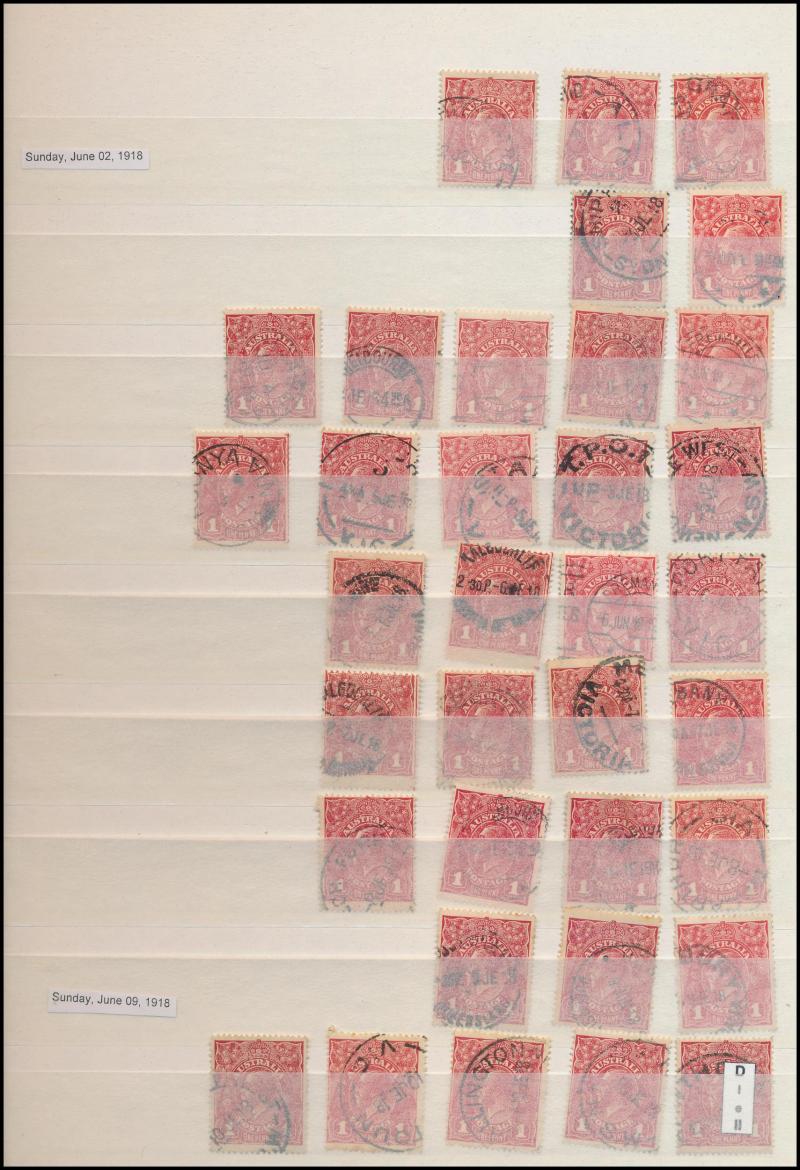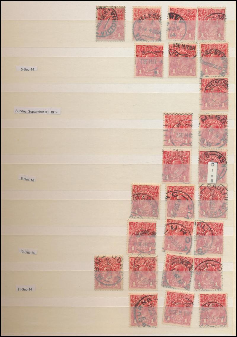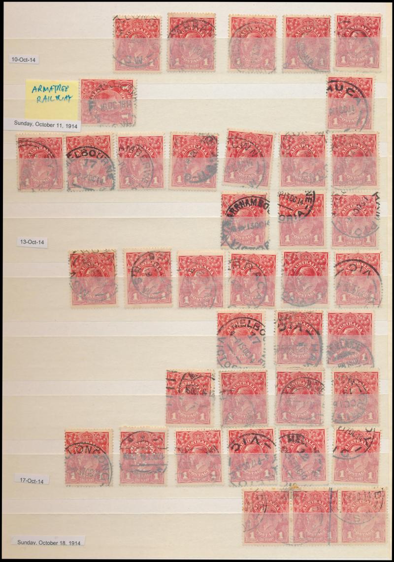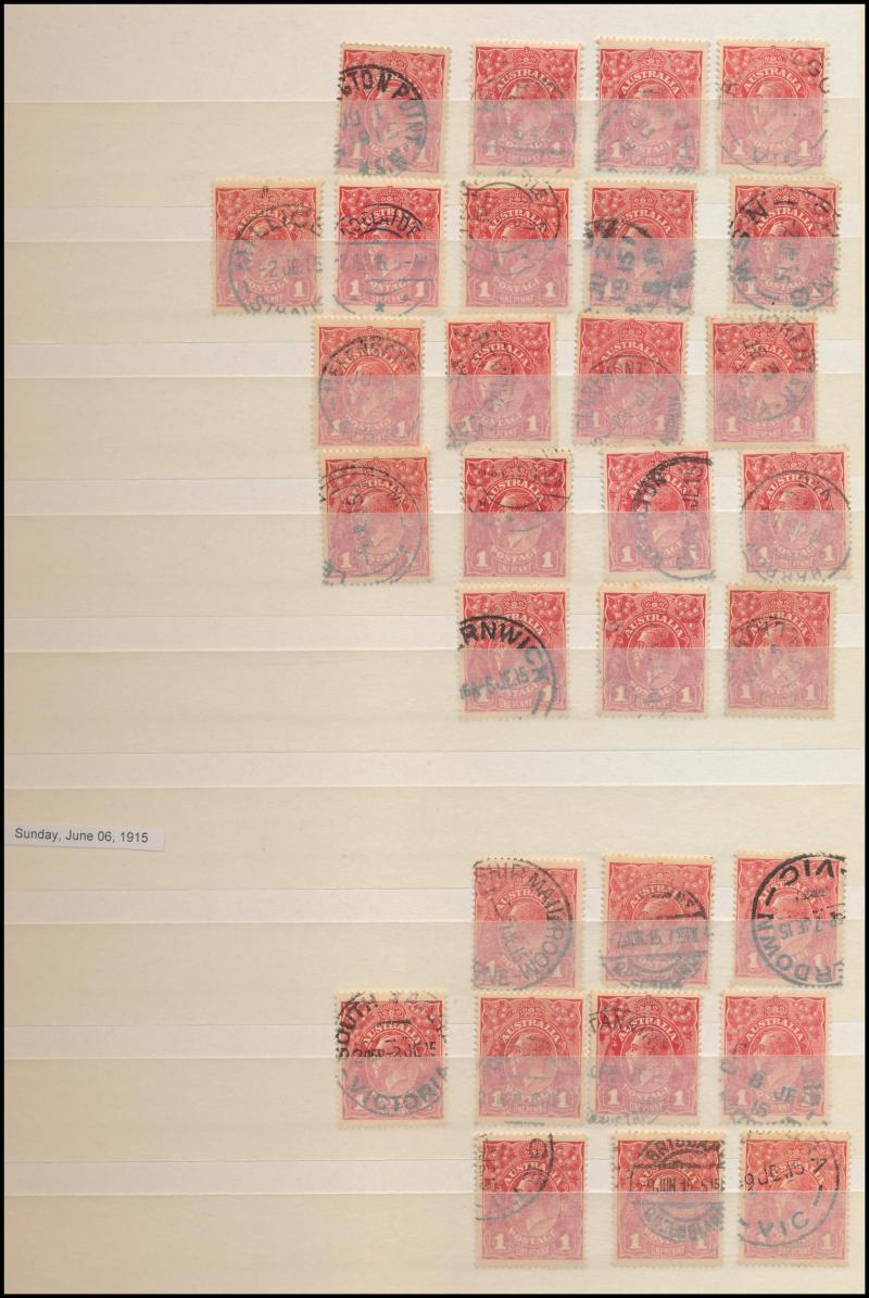 ONE PENNY: 1d red dated cancels collection in four 64-page stockbooks from 1914 to end 1921 virtually complete for the 1915-18