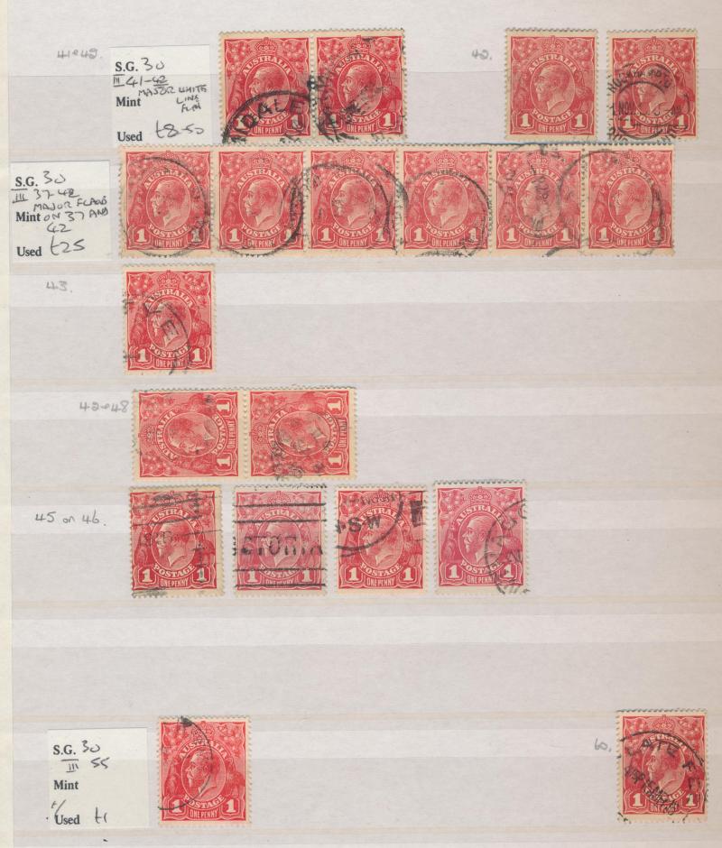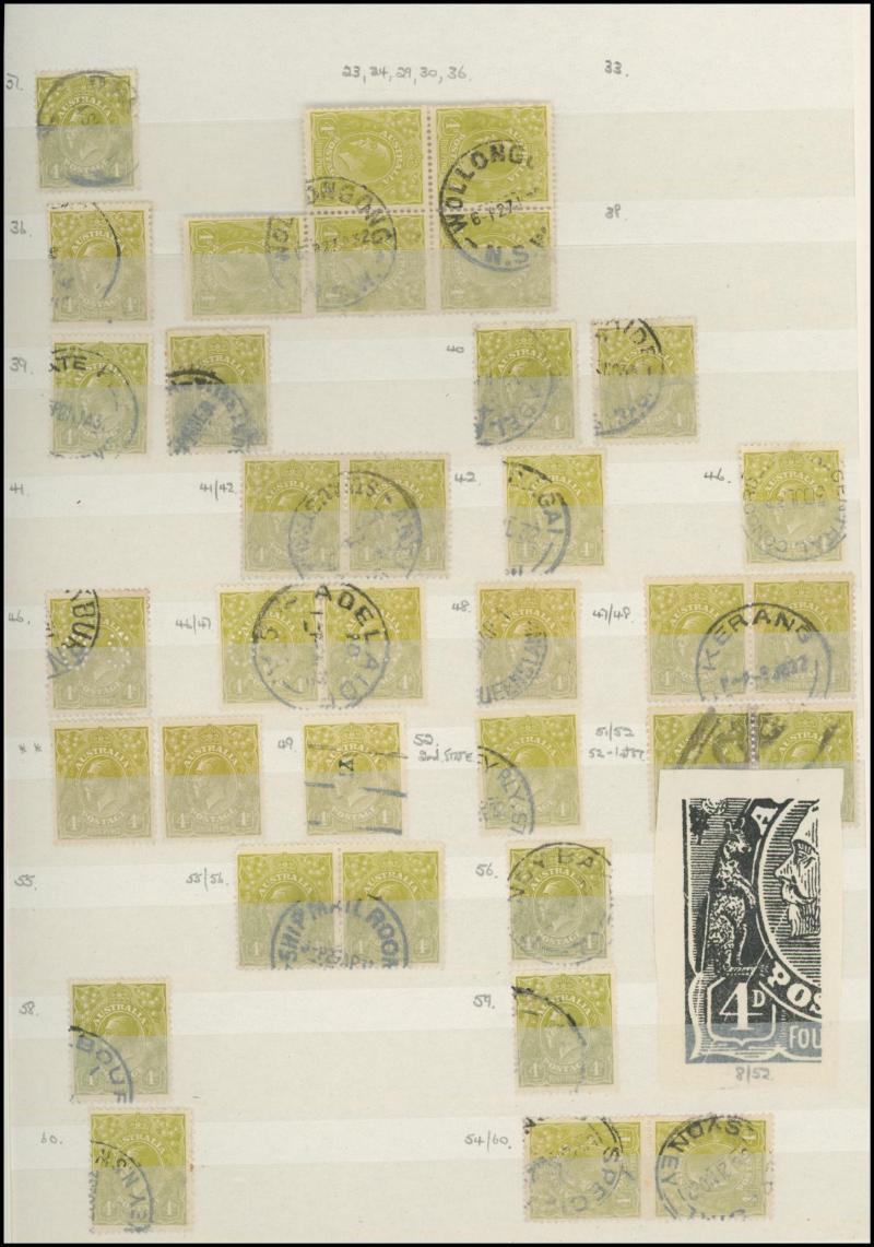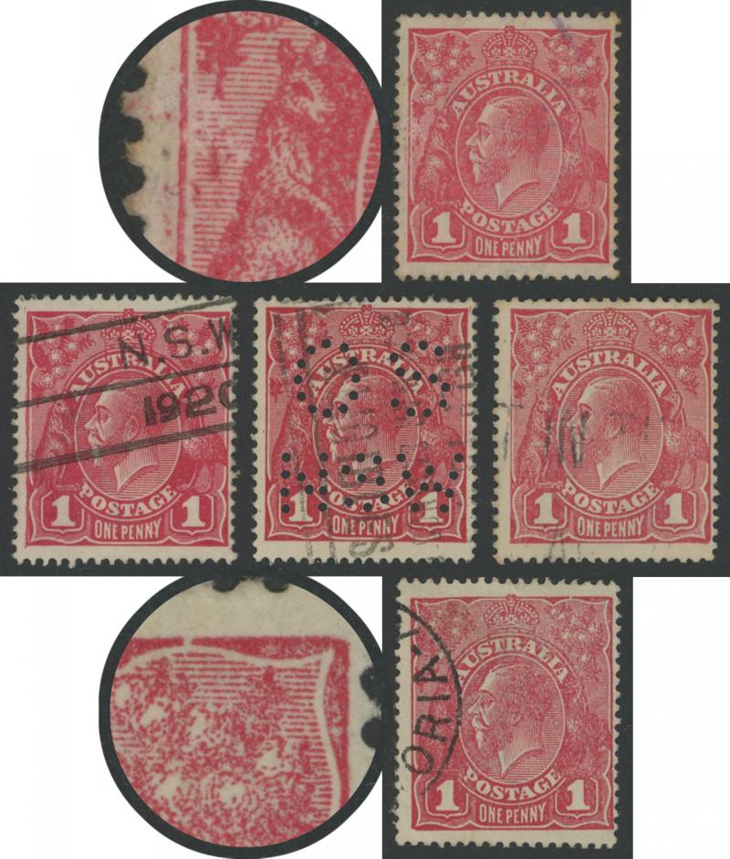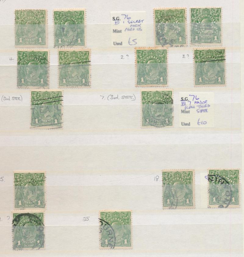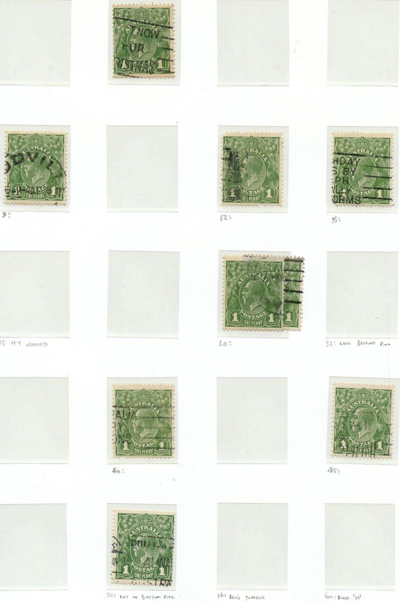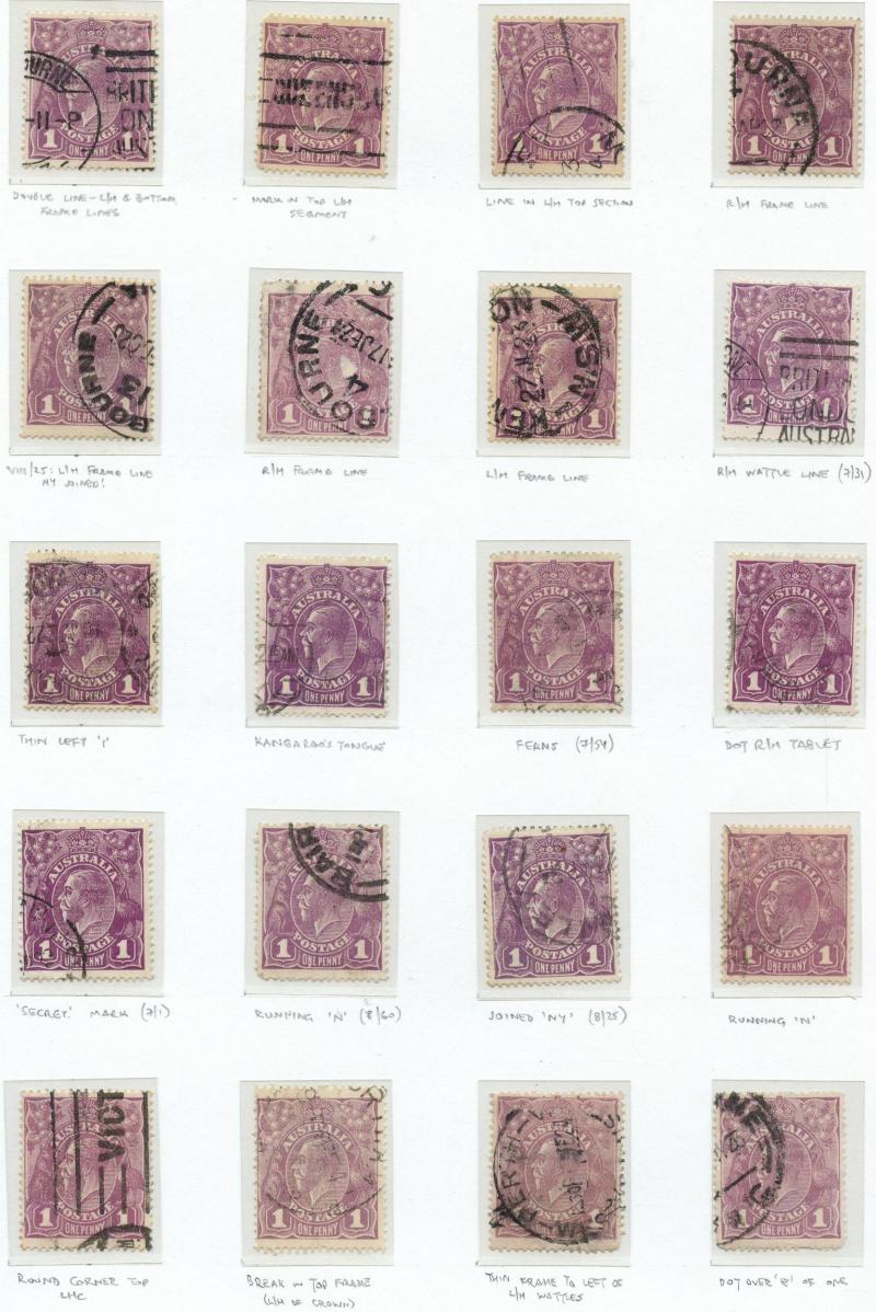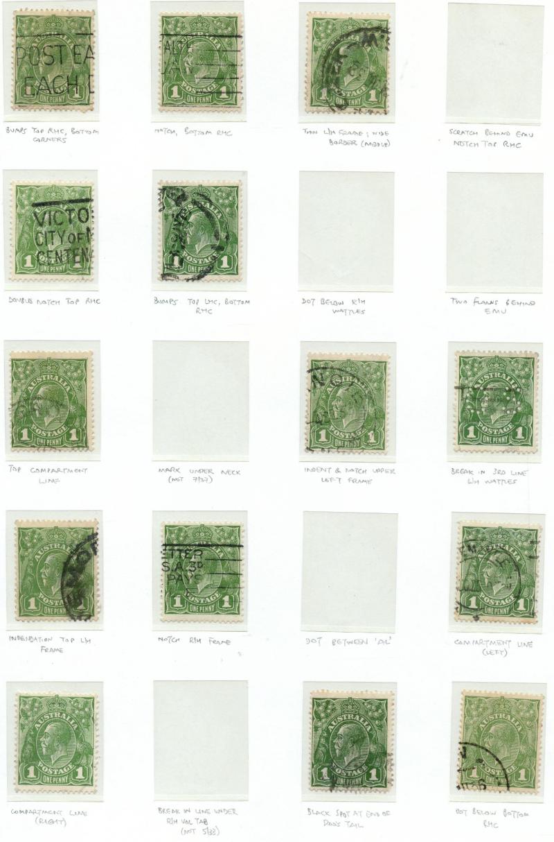 and Pregnant 'Y' x8, Dot before '1' & Thinned Left Frame pair, 'NY' Joined x3 plus examples of the position before the flaw developed, Scratch behind Kangaroo x25, Run 'N' Second & Third States x17, and many, many more, potential postmark interest