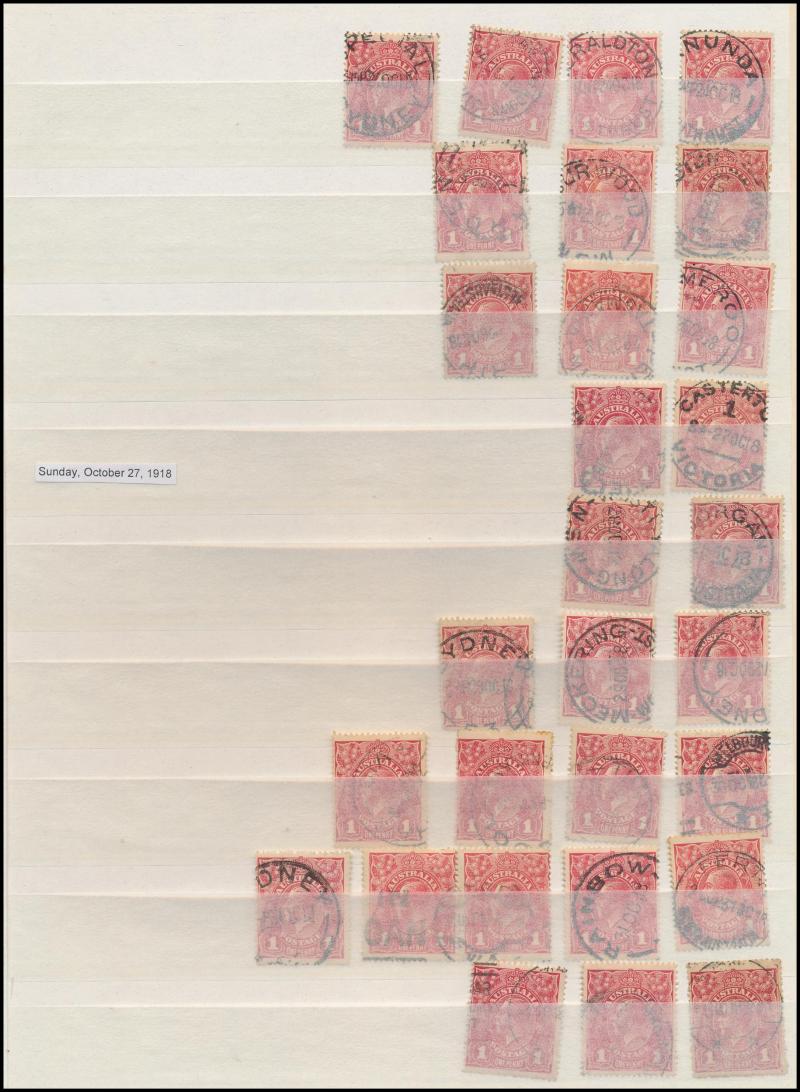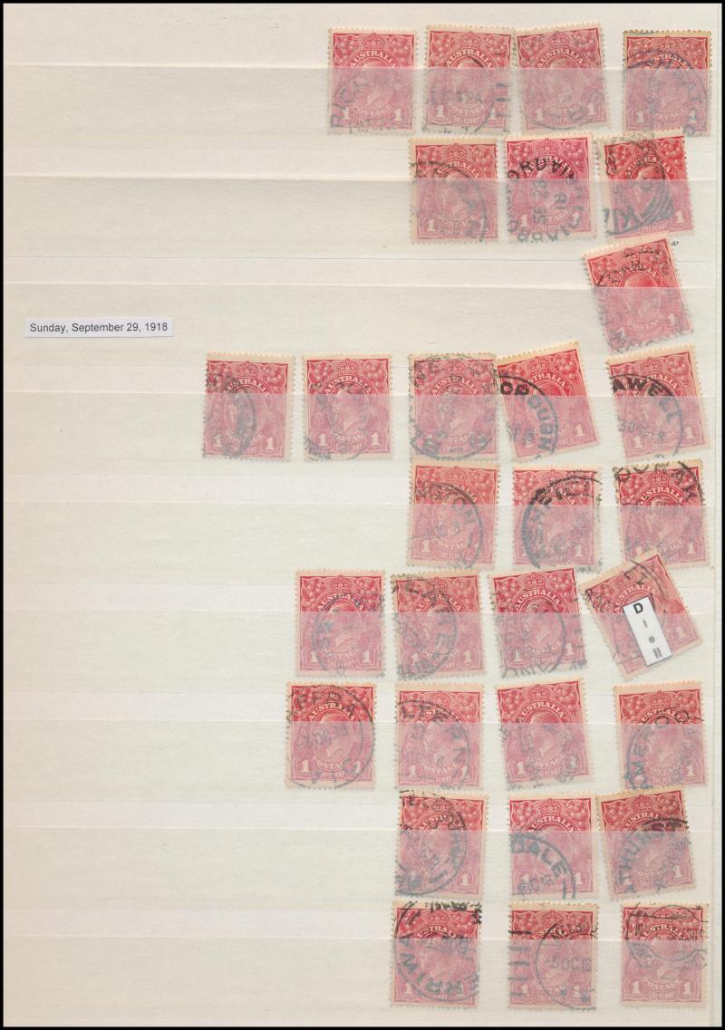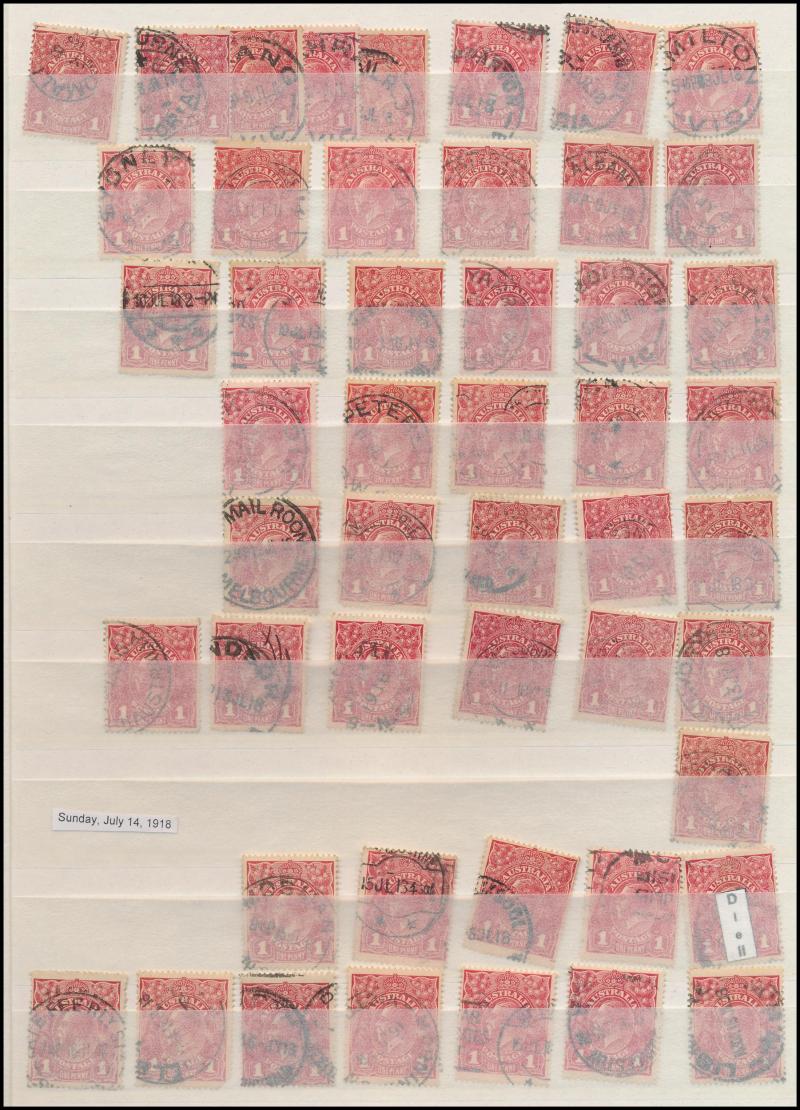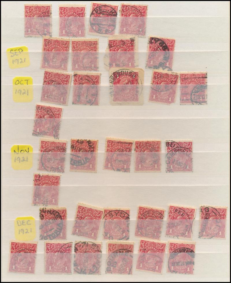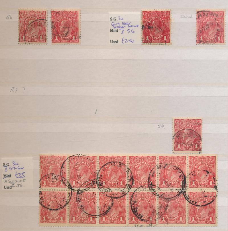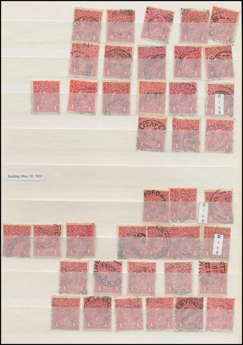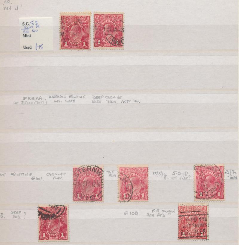 and Pregnant 'Y' x8, Dot before '1' & Thinned Left Frame pair, 'NY' Joined x3 plus examples of the position before the flaw developed, Scratch behind Kangaroo x25, Run 'N' Second & Third States x17, and many, many more, potential postmark interest