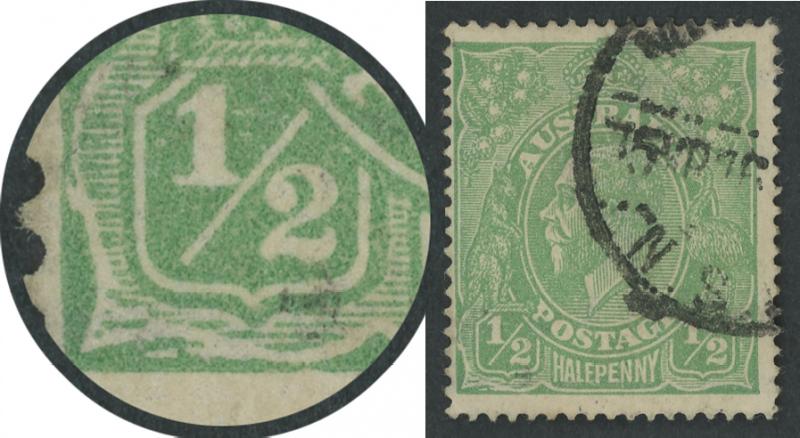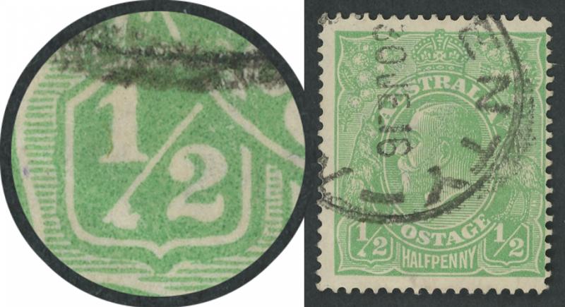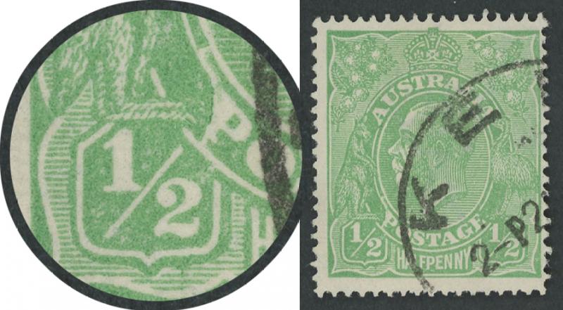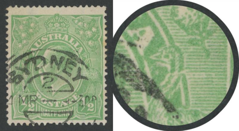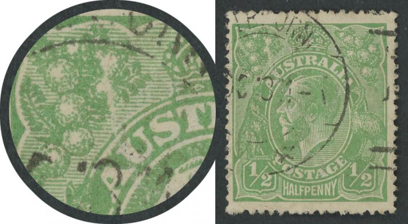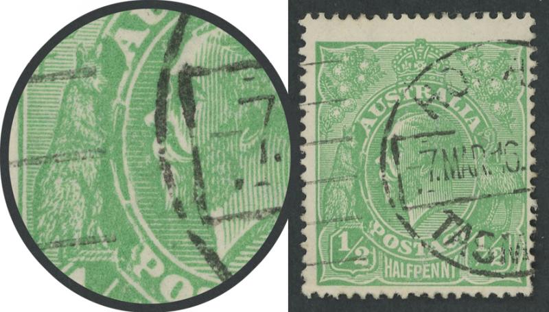 ½d green with Cracked Electro in Left Wattles (Early State) [Pos 5L46] ACSC 63(5)k (SG 20e), light Melbourne machine cancel just
