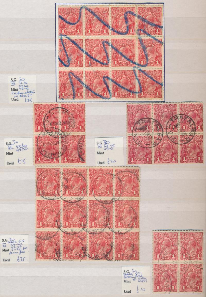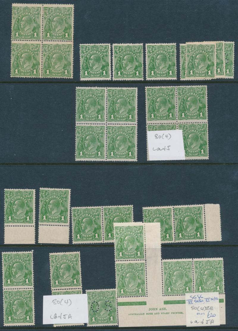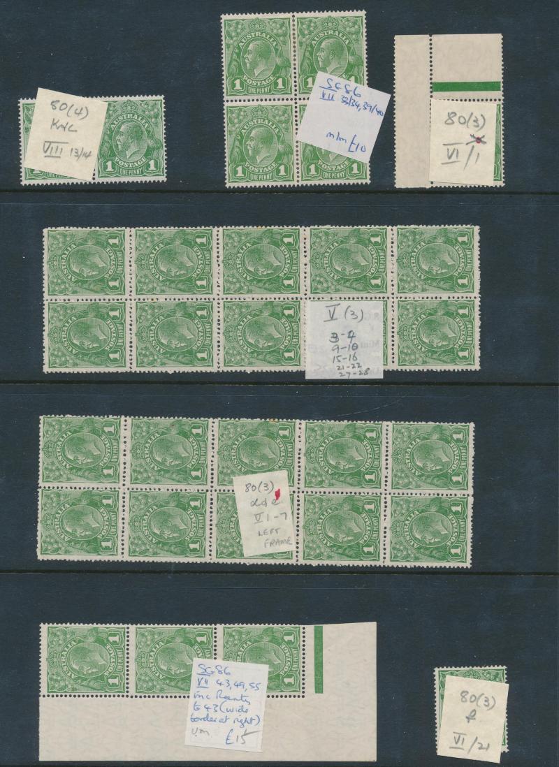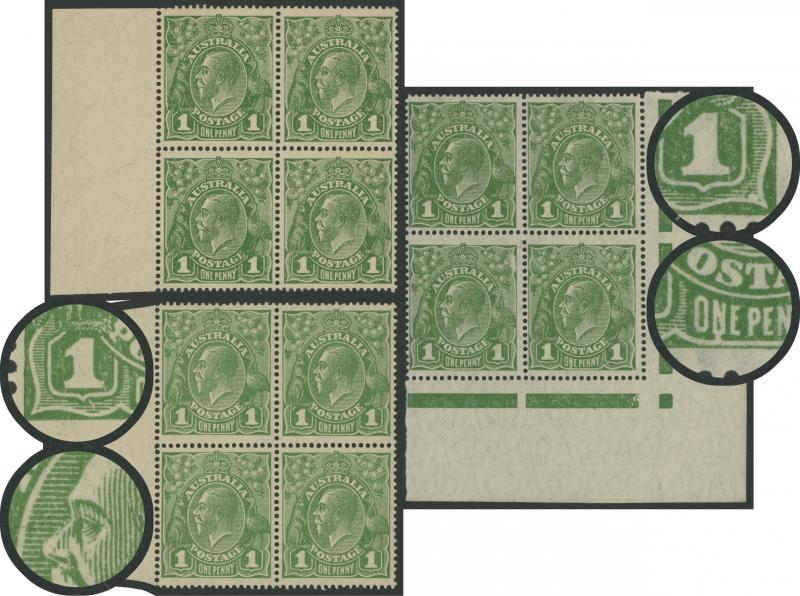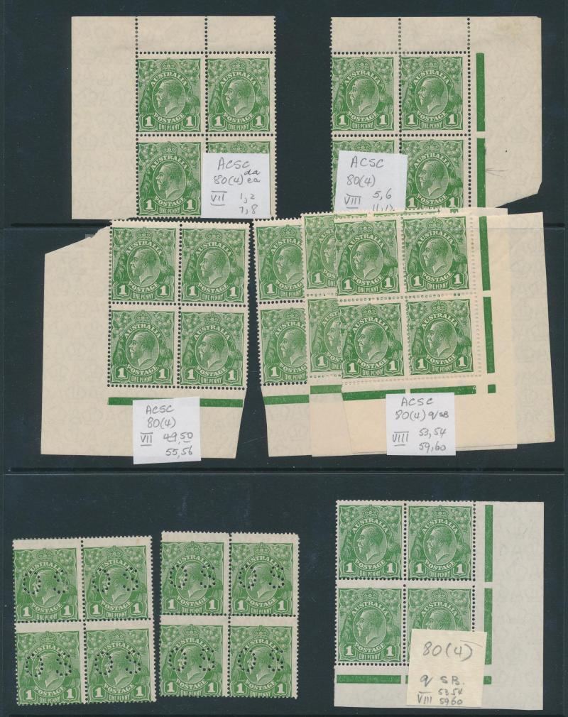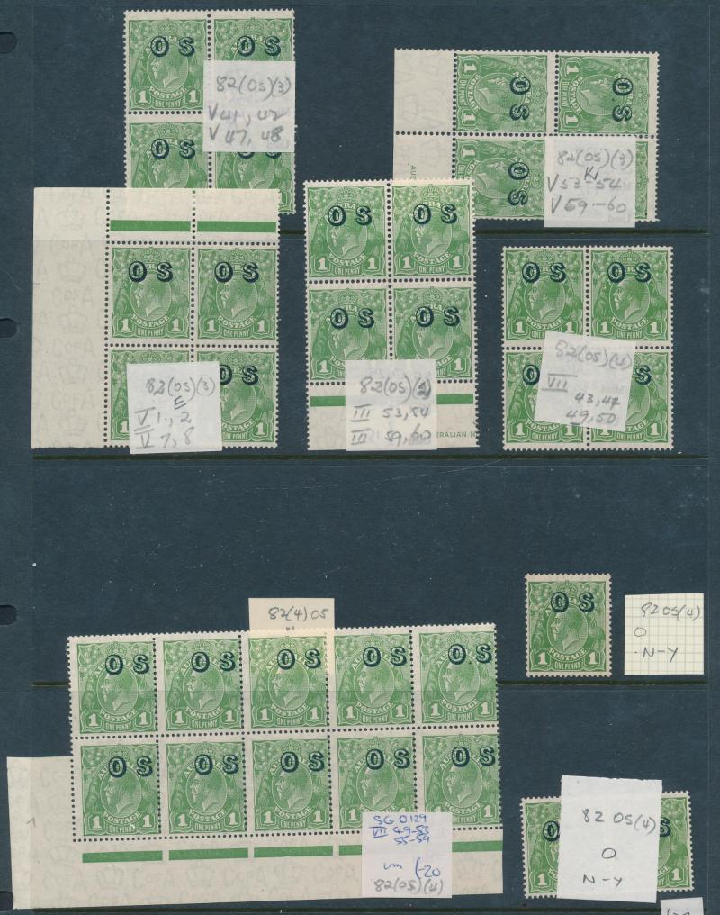 blocks of 4 x60+ including one with Corner Dot & Run 'N' (scarce unretouched) and a number with Wattle Line & Neck Flaw including retouches, and so on including CofA Wmk 'OS' Overprints noted a block of 20 with Notched Upper Left Corner, White