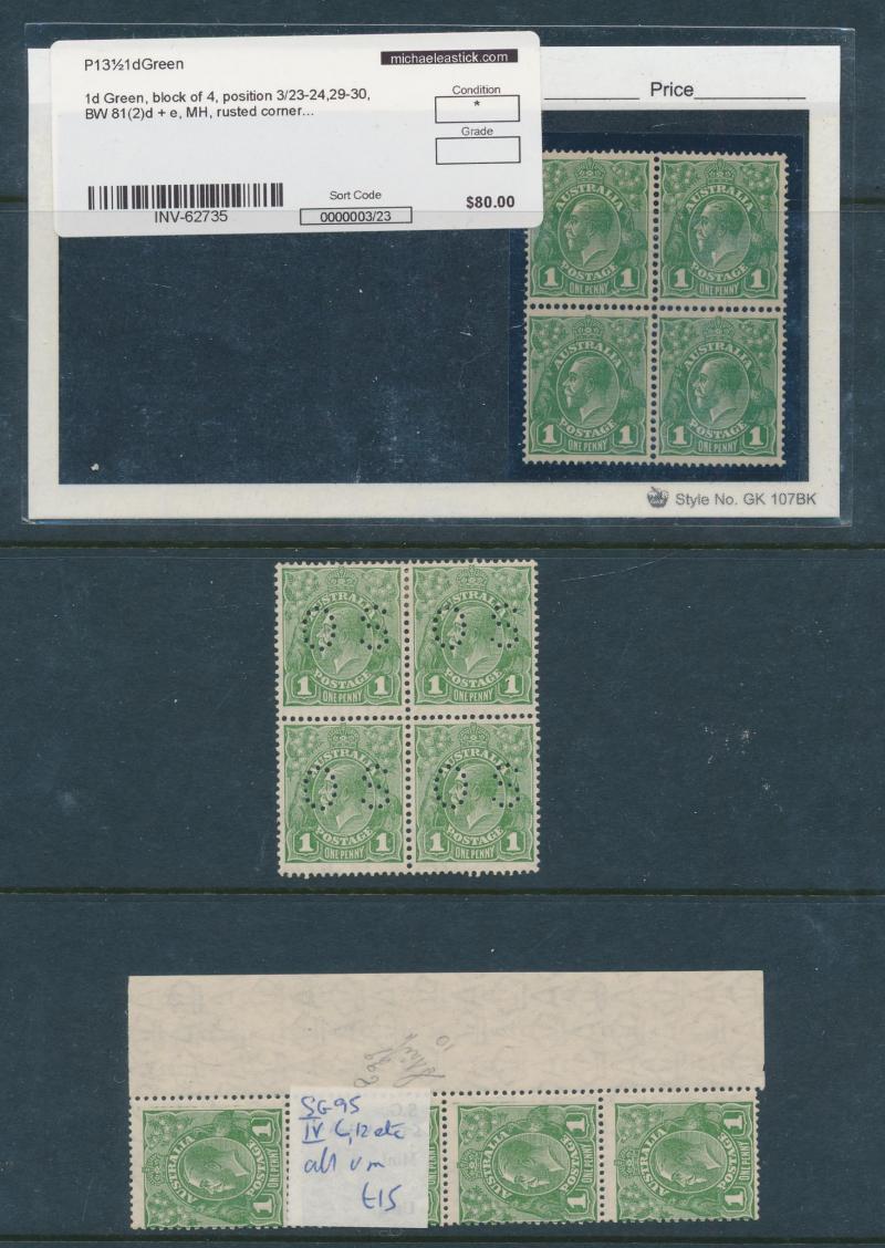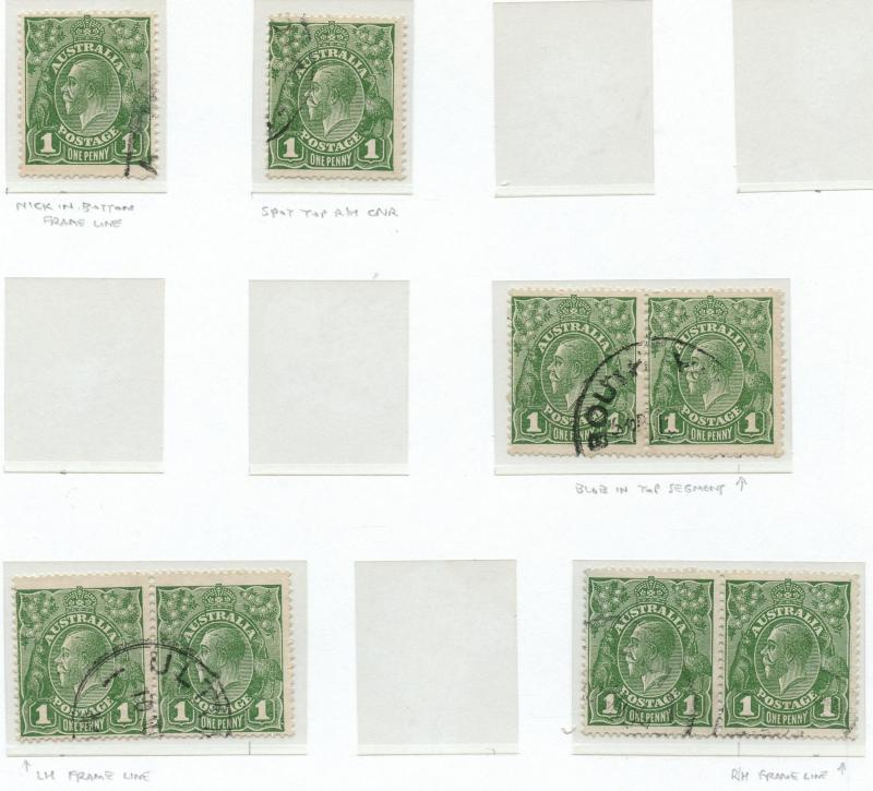 including punctured 'OS' block of 4, Notch in Left Frame in pair with normal, Break in Left Frame single, Dot Before '1' in a block of 9 (!), Thin 'ONE PENNY' punctured 'OS' single, Run 'N' x2 very different states, etc, then 1d green in two