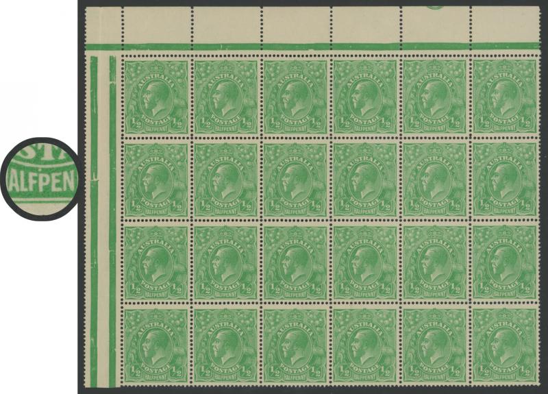 ½d emerald SG 20 Electro 2 block of 24 (6x4) from the top of the right pane with No Top to Crown [Pos 2R4] and White Spot over 'P'