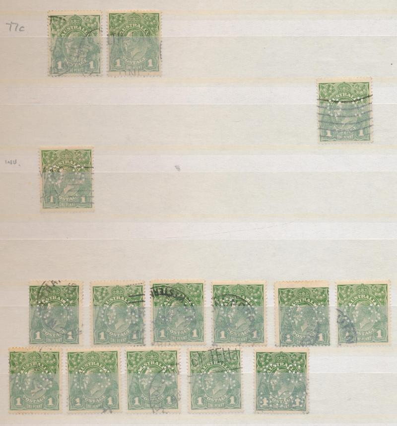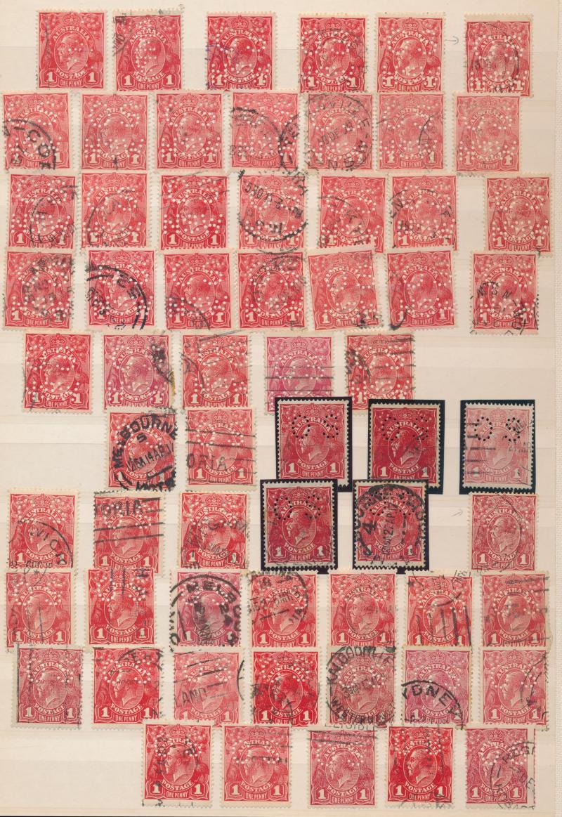 Small Multiple Wmk punctured 'OS' x2, some Federal & State Government punctures and groups of unplated examples many with dated cancels & potential postmark interest, condition generally fine to very fine. Ex David Adams. Weighs 2kg.