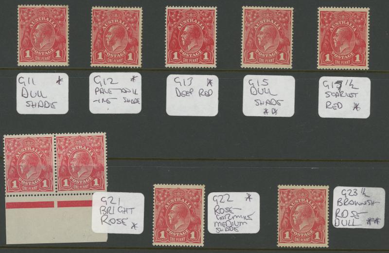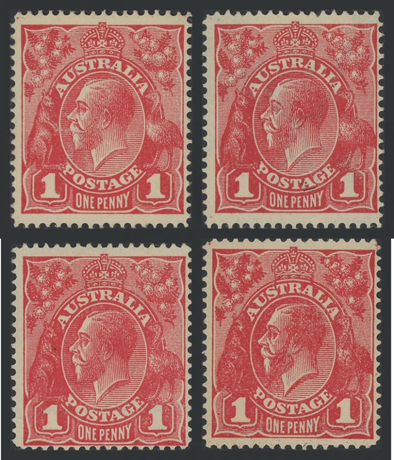 ONE PENNY: 1d red Smooth Paper shades assembled by Simon Dunkerley comprising Single Line Perf x4 (two **; the ACSC lists only two