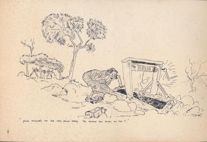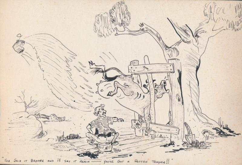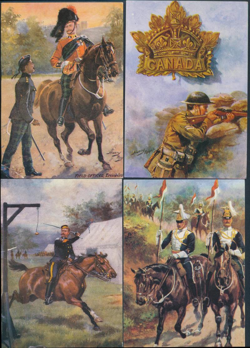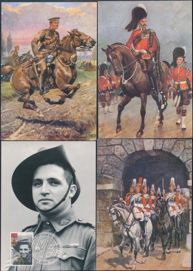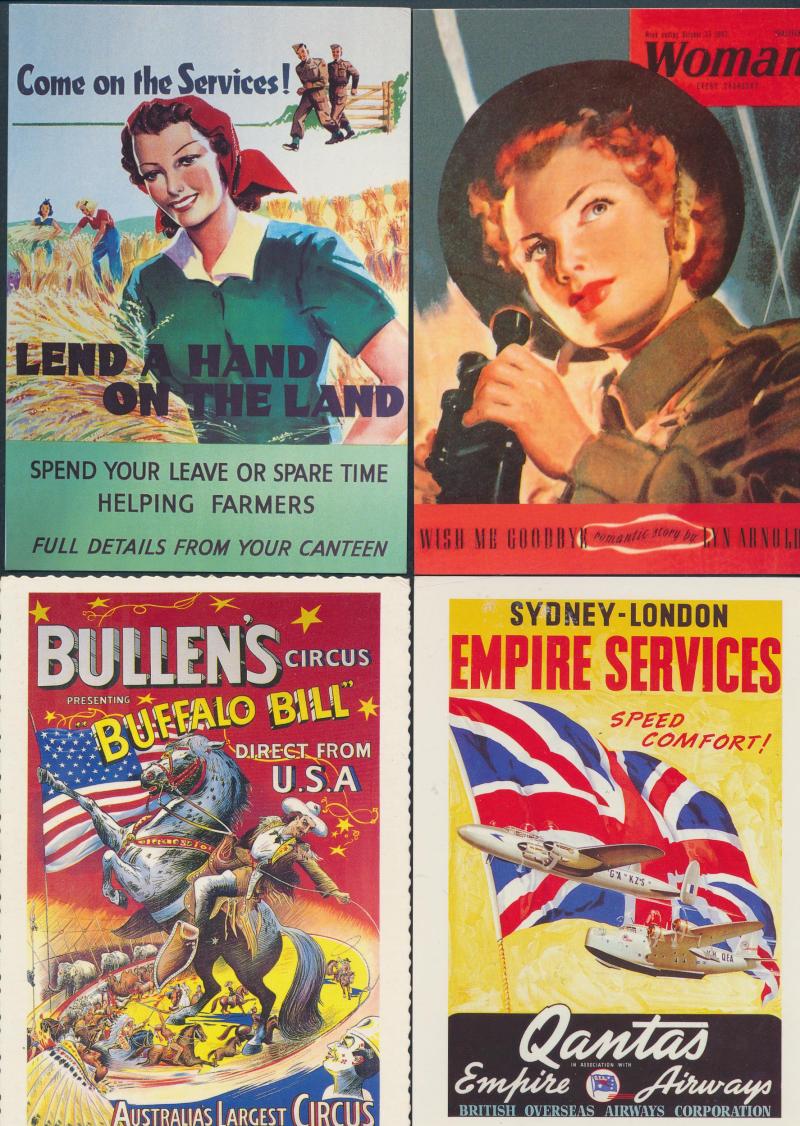 original cartoon drawings (2) in the style of Saltbush Bill; also range of postcards (43) including military uniforms (20) & Queen Elizabeth (5), mainly Fair/Fine condition.