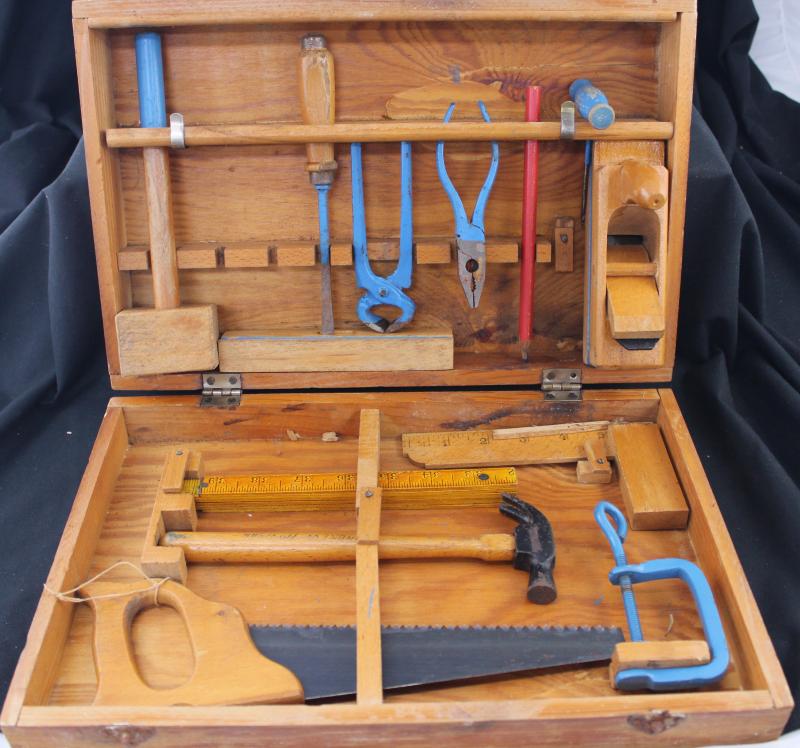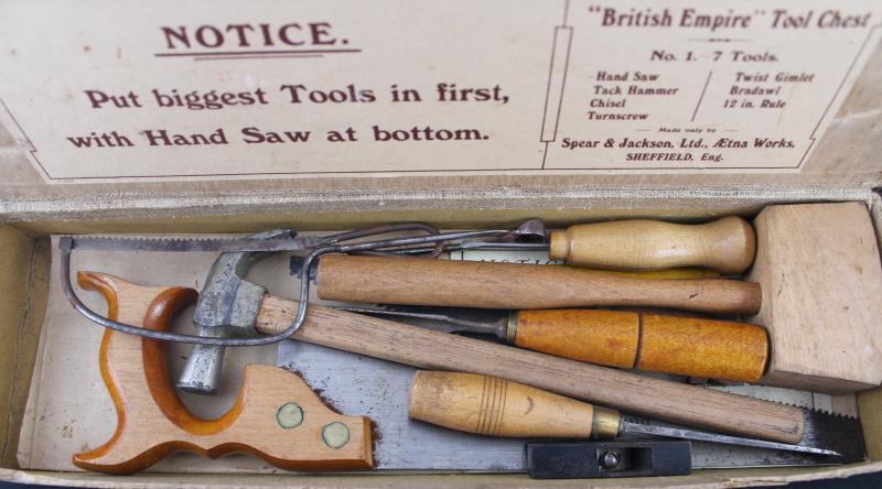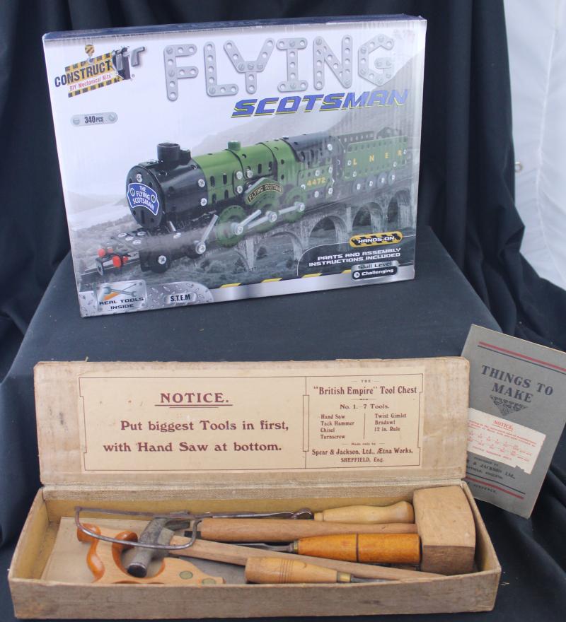 No.6 in tin (incomplete) & Set No.3; Spear & Jackson 'The British Empire Tool Set No.1'; tool chest; plus a Meccano/Ezy-Bilt aeroplane, Fair/Fine condition.