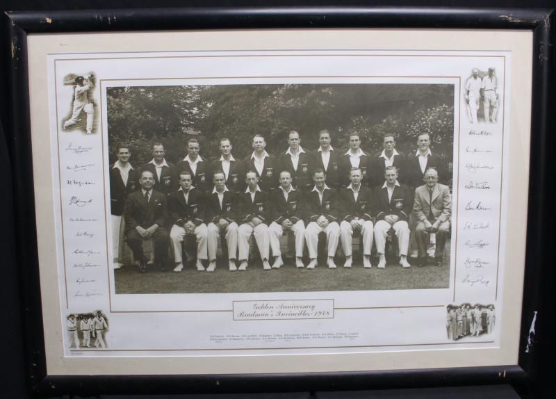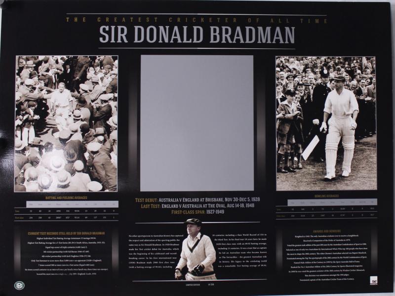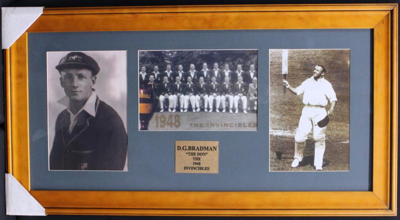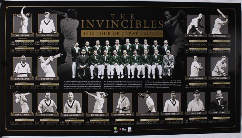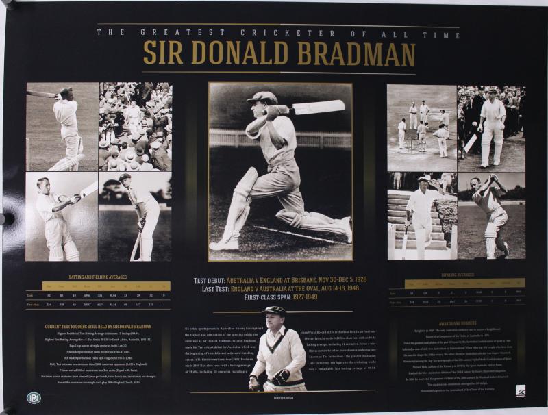 Posters including 'The Greatest Cricketer of All Time - Sir Donald Bradman', 'Sir Donald Bradman' (2), 'The Invincibles' (2
