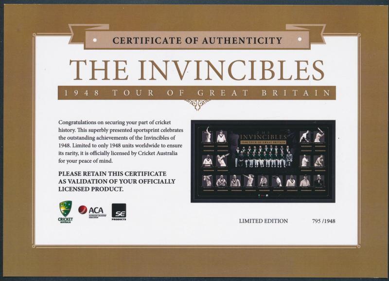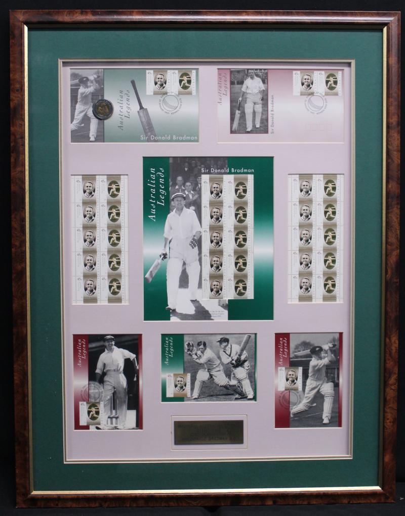 Posters comprising 'Australia Post - Sir Donald Bradman', 'Golden Anniversary - Braman's Invincibles 1948', 'Allan Border' with