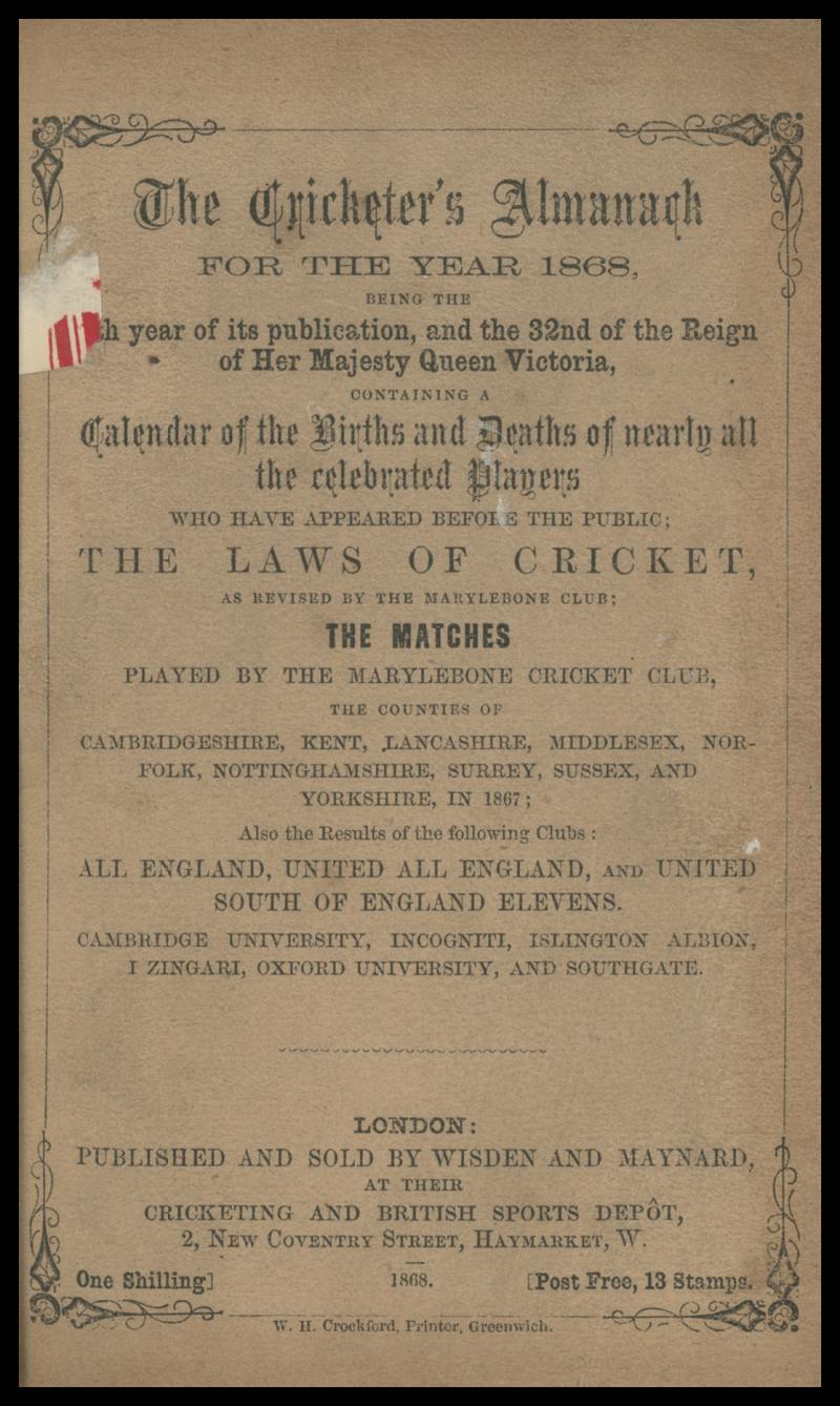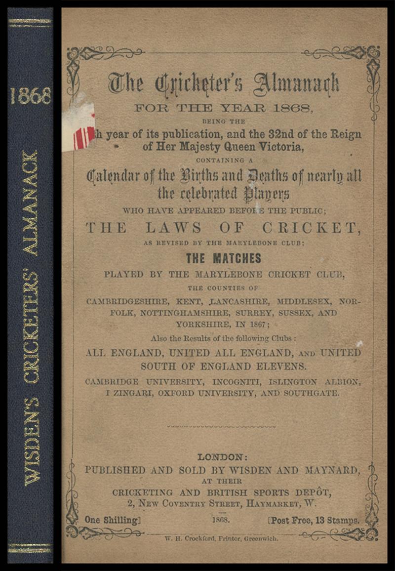 Wisden Cricketers Almanack for 1868 (5th Year), with original paper wrappers, rebound in blue cloth with gilt lettering on spine,