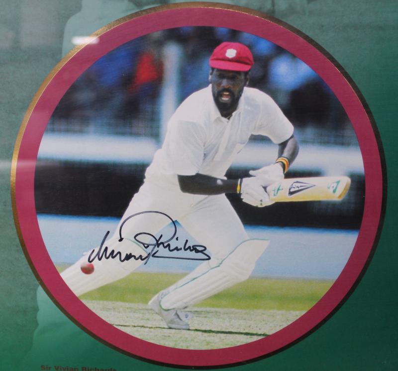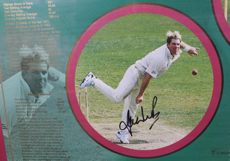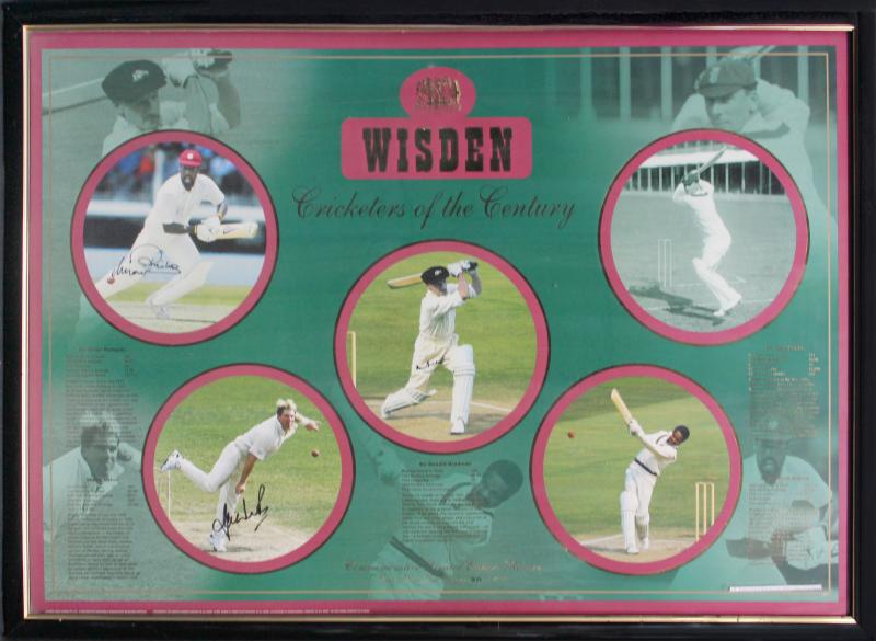 Signed print 'Wisden Cricketers of the Century' print signed by Don Bradman, Shane Warne & Viv Richards, framed & glazed, overall