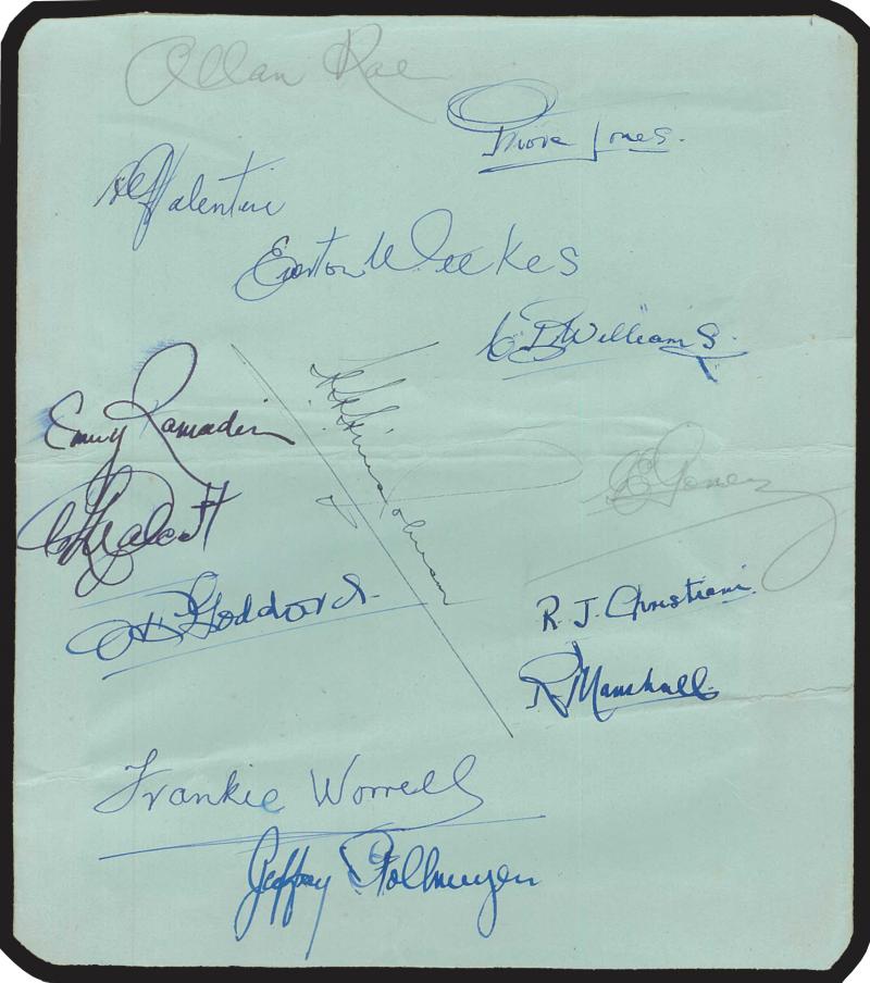 autographs); plus West Indies 1950 autograph page; good range of signatures including Frank Worrell, Everton Weekes, Clyde Walcott, Ted Dexter, Colin Cowdrey, John Reid & Hanif Mohammad, mainly Fair/Fine.