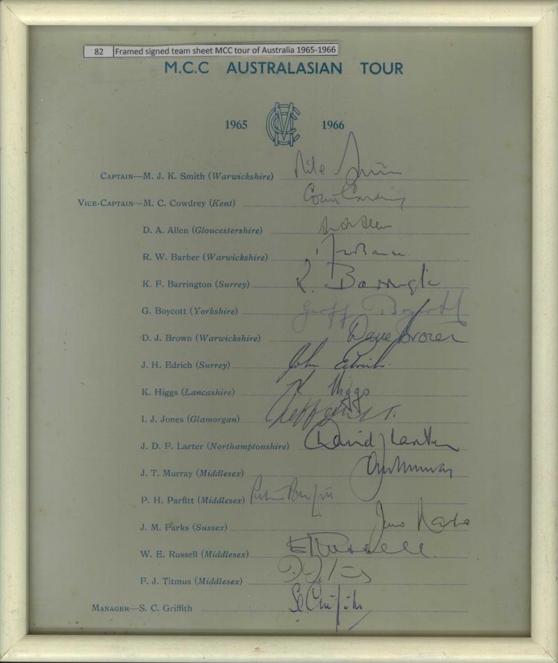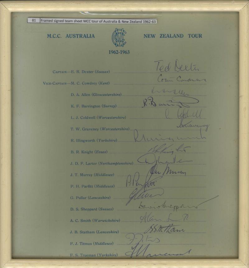 Team Sheets Framed group including England 1962-63 & 1965-66; New Zealand 1965; Pakistan 1964-65; West Indies 1963 (with facsimile