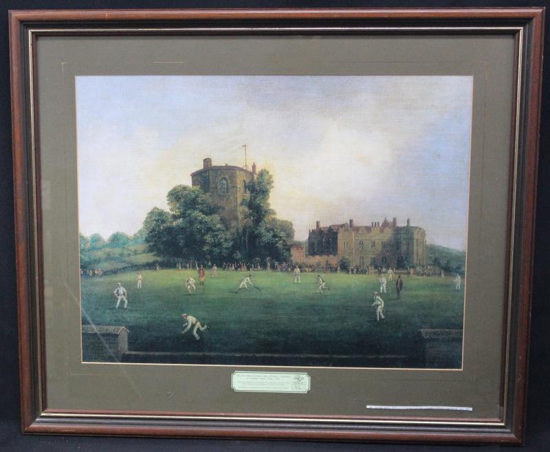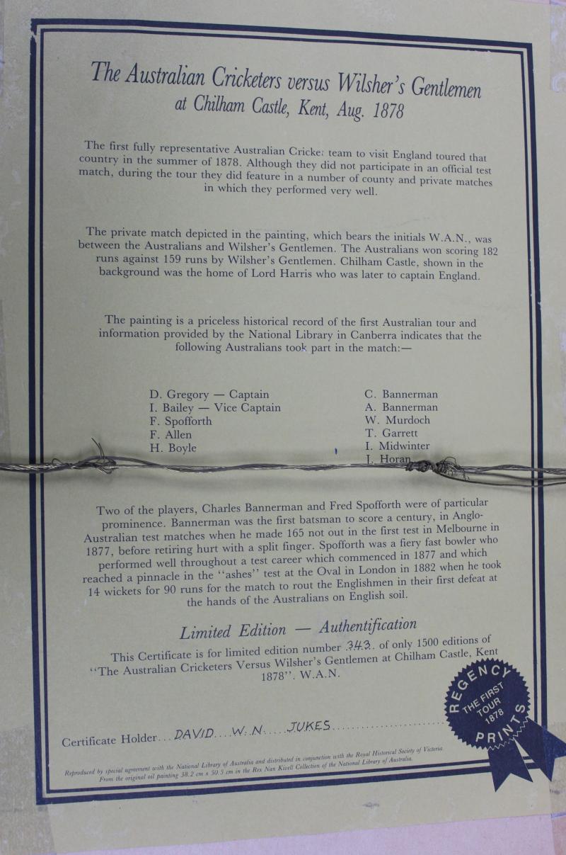 Prints 'The Australian Cricketers versus Wilsher's Gentlemen at Chatham Castle, Kent 1878' (framed 66x56cm); plus 'WM Woodfull, The