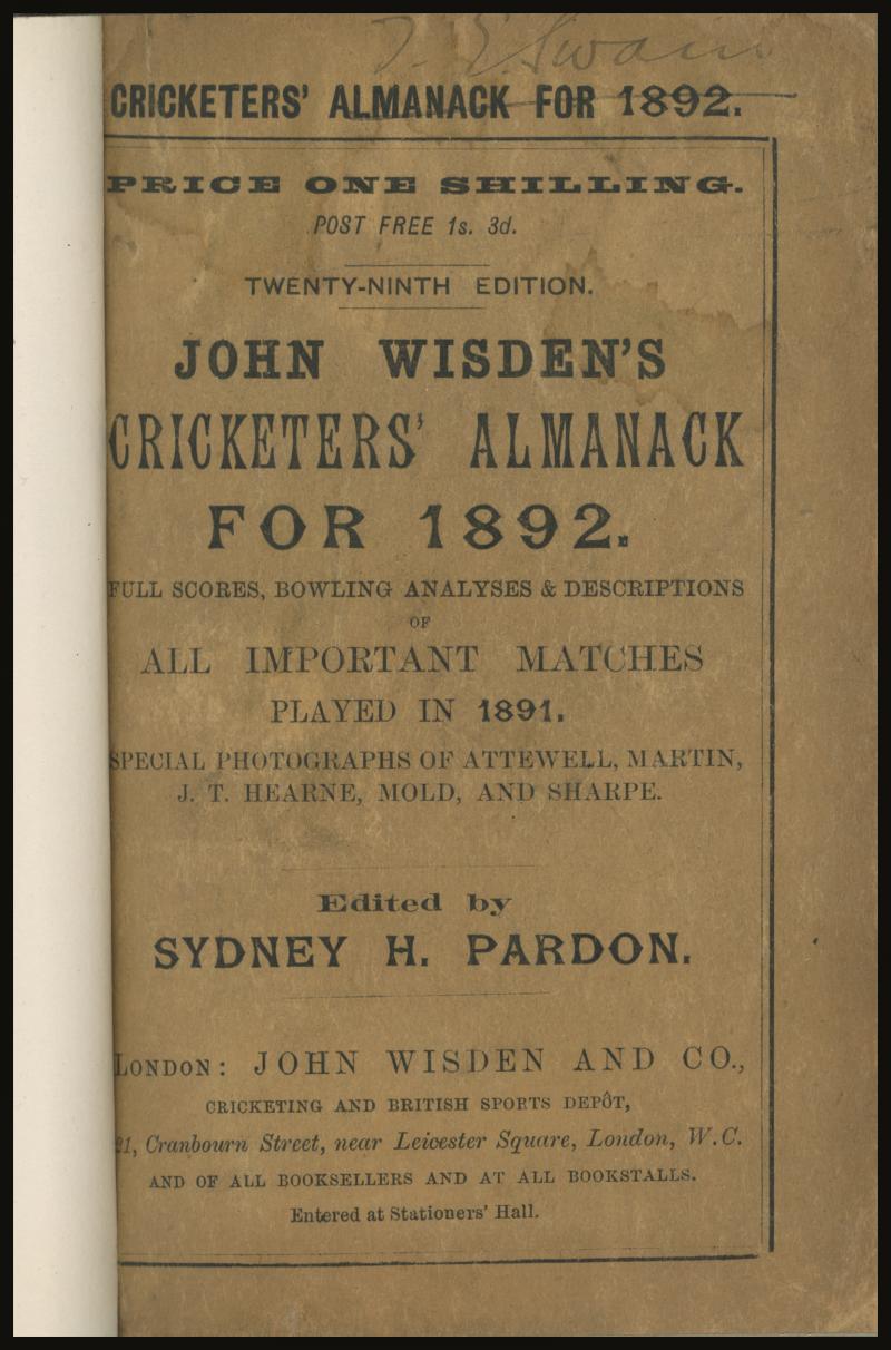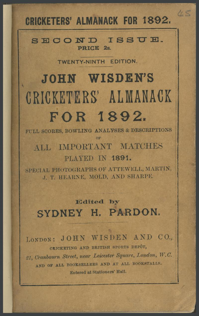 Wisden Cricketers Almanack for 1892 (29th Year), with original wrappers, rebound in blue cloth with gilt lettering on spine,