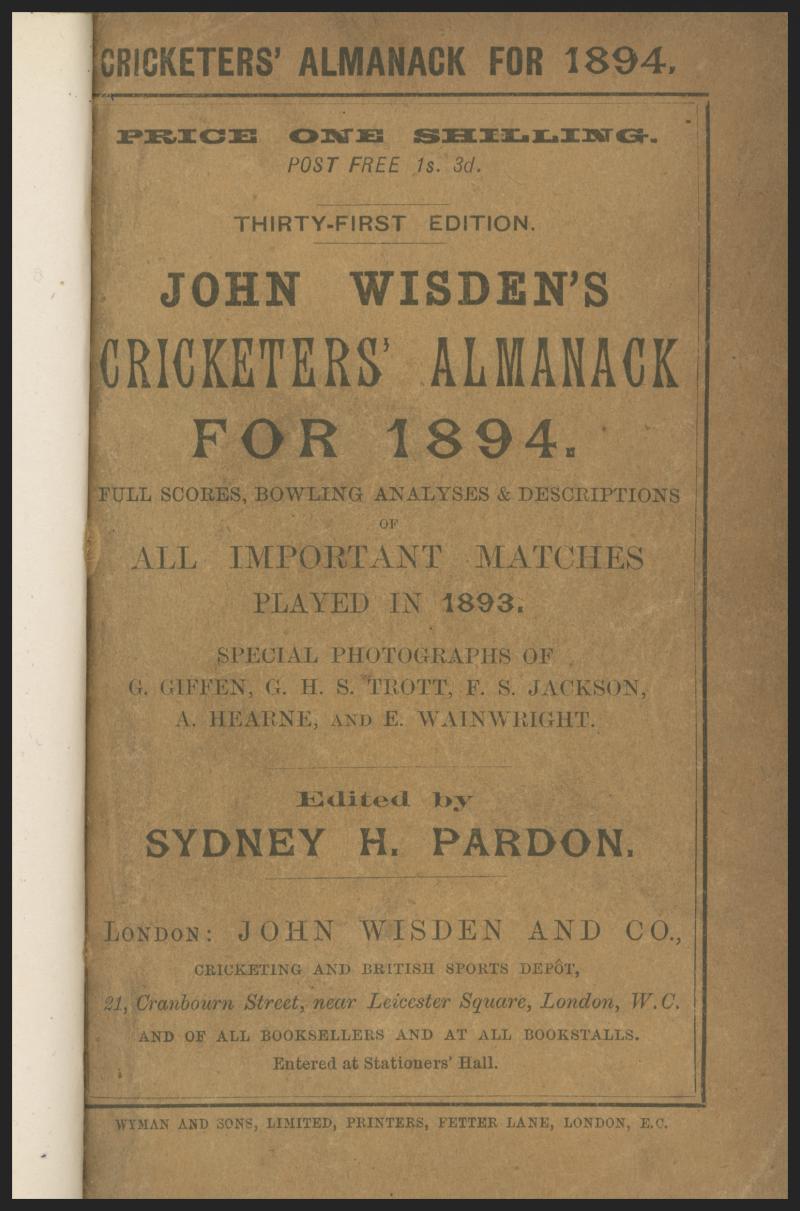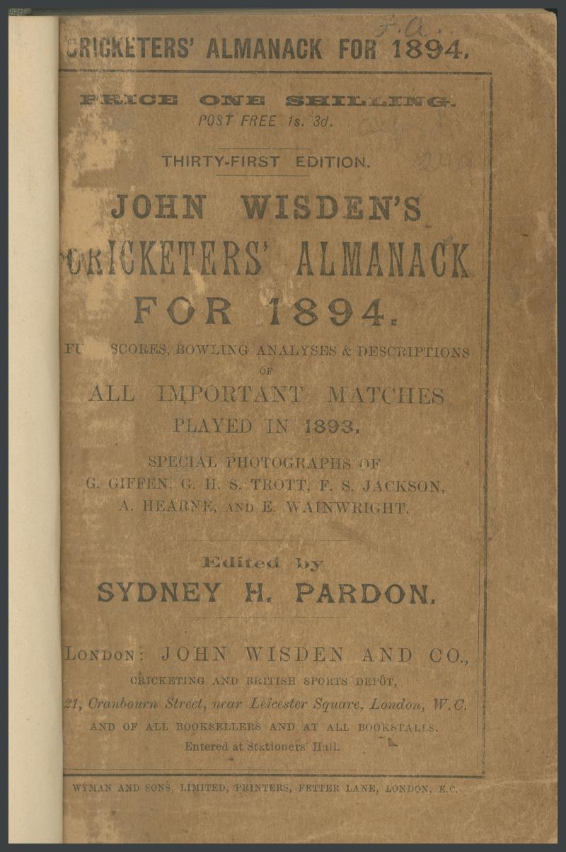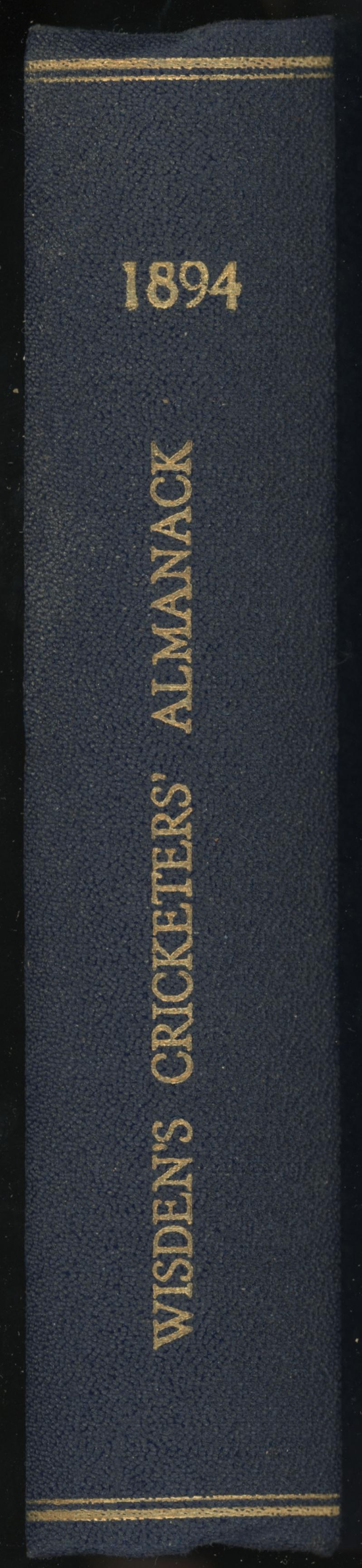 Wisden Cricketers Almanack for 1894, with original wrappers, rebound in blue cloth with gilt lettering on spine, Fair/Fine