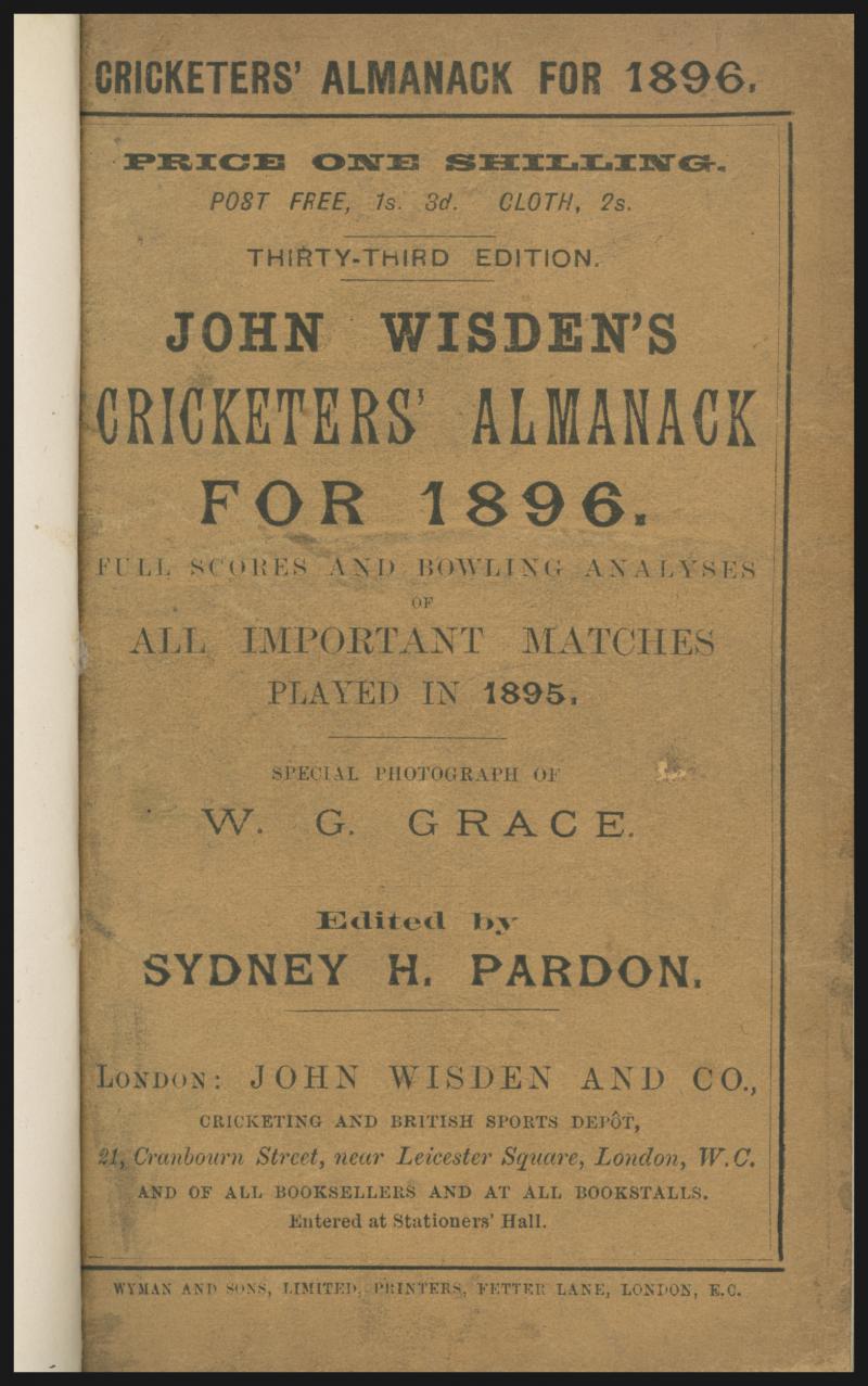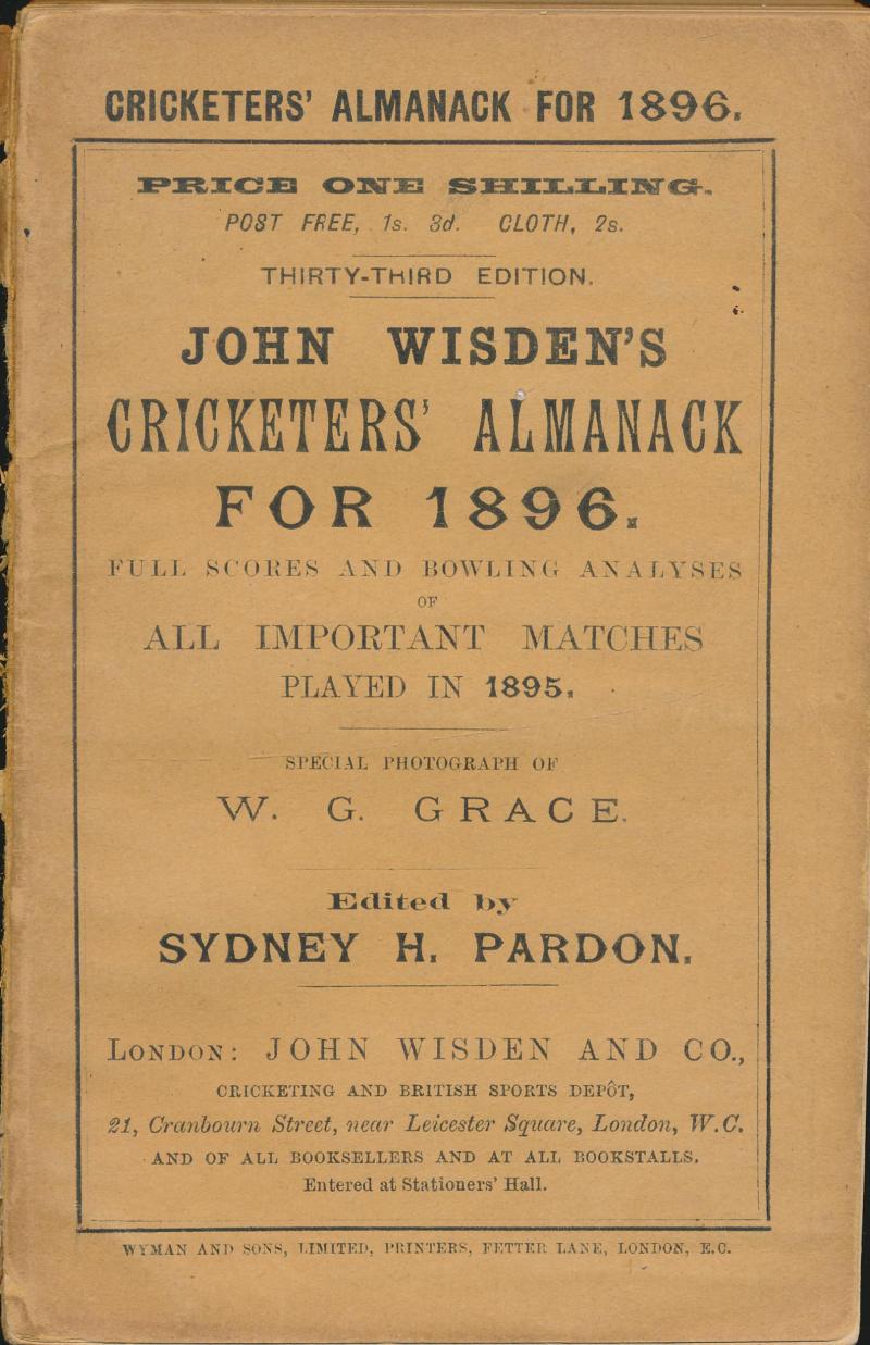 Wisden Cricketers Almanack for 1896, with original wrappers, spine damaged, Fair condition. (Image1) (Image2)