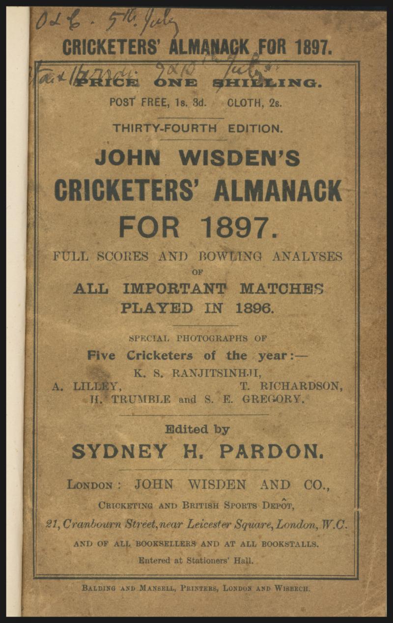 Wisden Cricketers Almanack for 1897, with original wrappers, rebound in blue cloth with gilt lettering on spine, Fine condition. (Image1) (Image2)