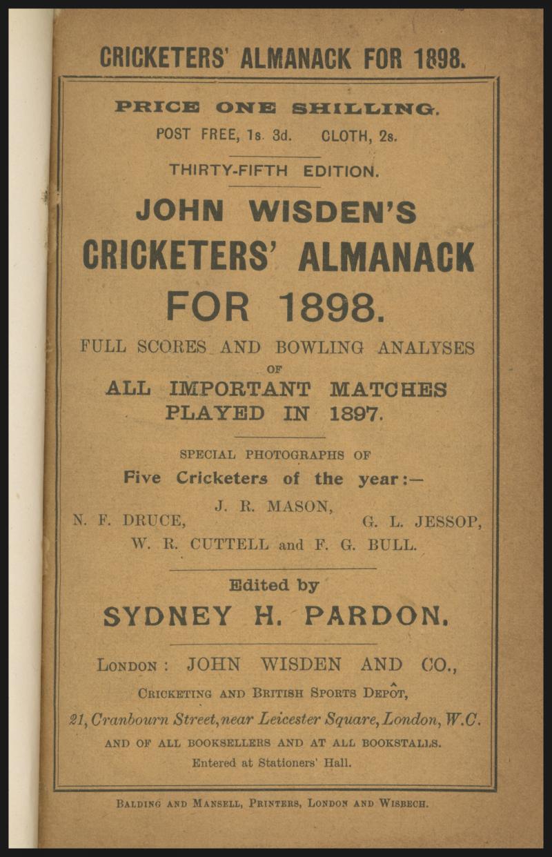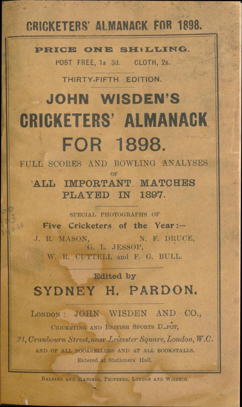 Wisden Cricketers Almanack for 1898, with original wrappers, rebound in brown cloth with gilt lettering on spine, Fair/Fine