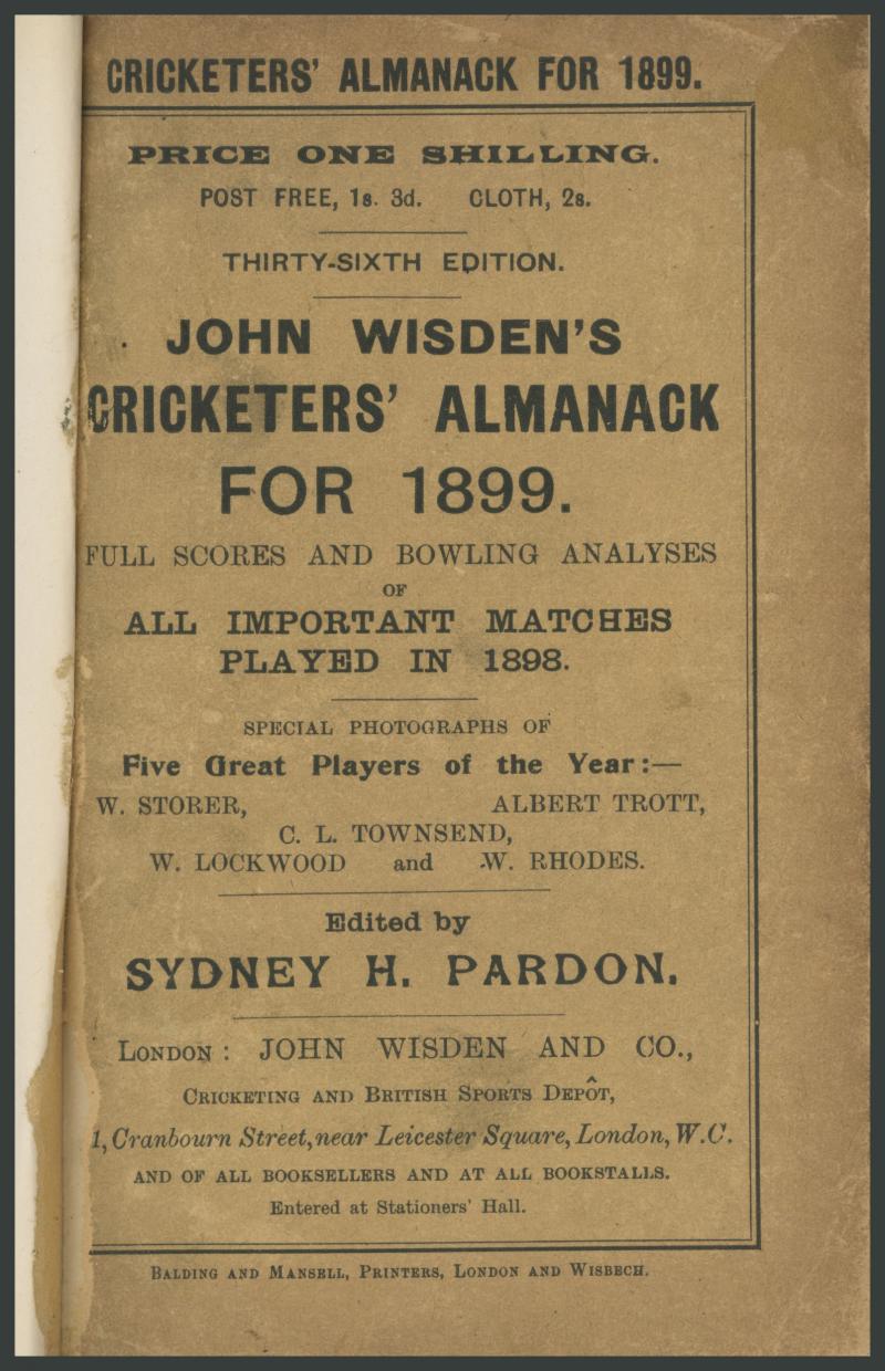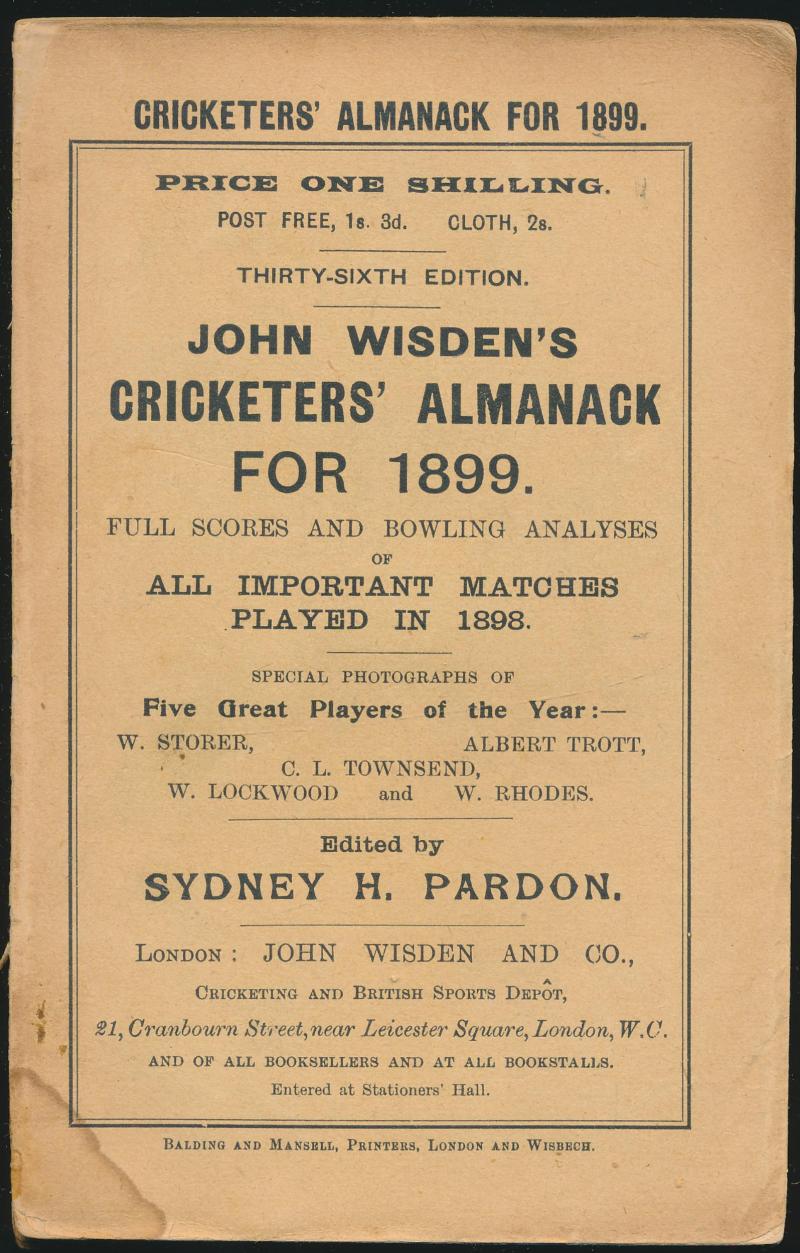 Wisden Cricketers Almanack for 1899, with original wrappers, spine damaged, Fair condition. (Image1) (Image2)