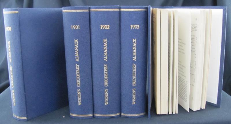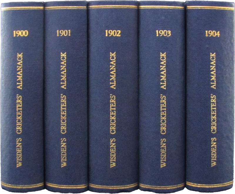 Wisden Cricketers Almanack for 1900-1904, all with original wrappers, rebound in blue cloth with gilt lettering on spine, Fine
