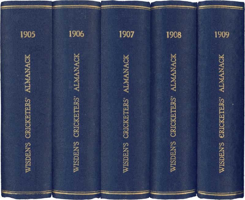 Wisden Cricketers Almanack for 1905-1909, all with original wrappers, rebound in blue cloth with gilt lettering on spine, Fine