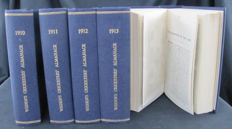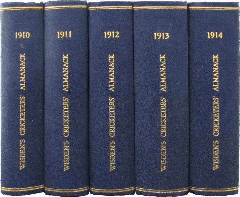 Wisden Cricketers Almanack for 1910-1914, all with original wrappers, rebound in blue cloth with gilt lettering on spine, Fine