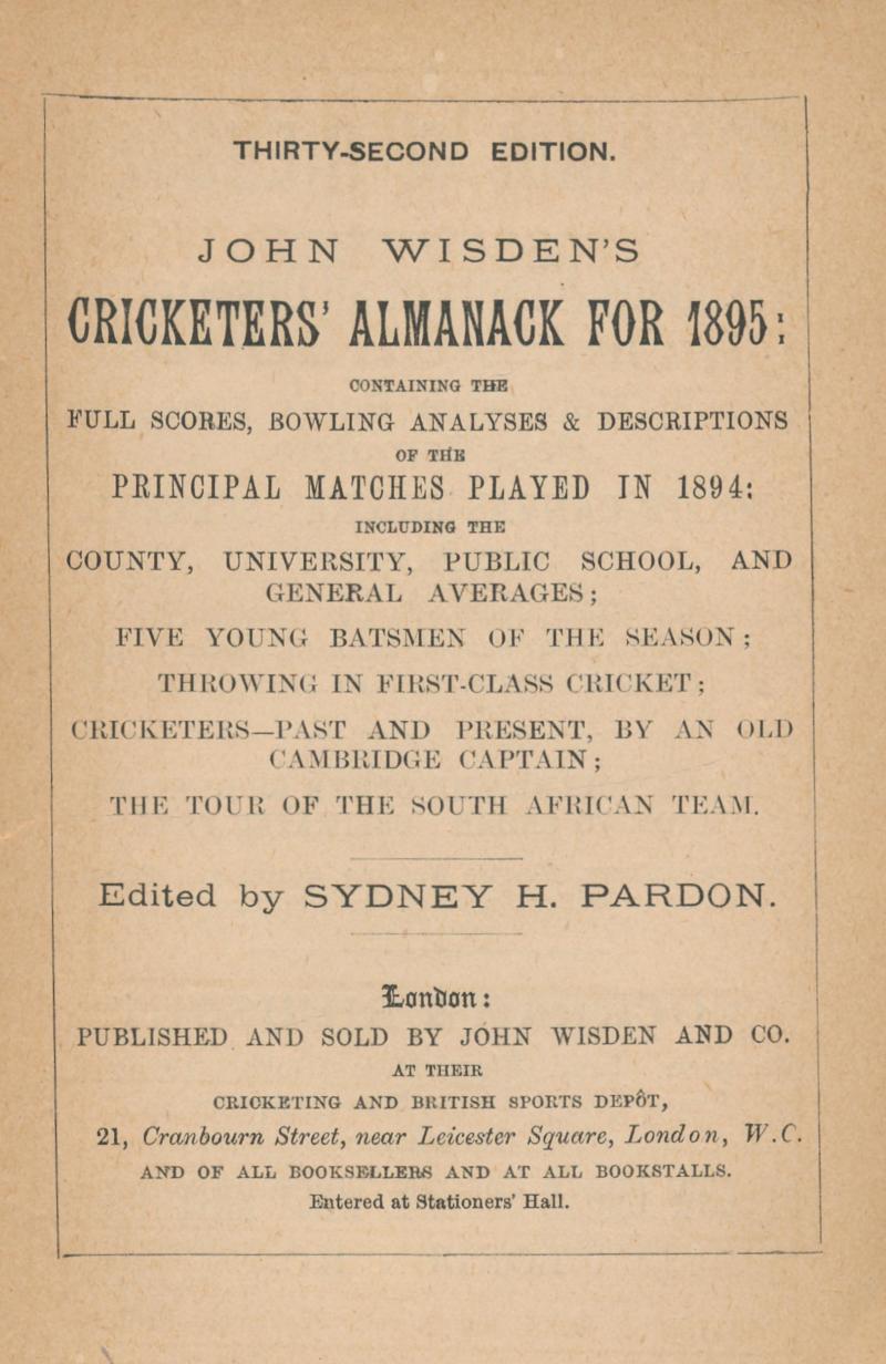 Wisden Cricketers Almanack for 1895, missing front wrapper, spine damaged, Fair condition. (Image1) (Image2)