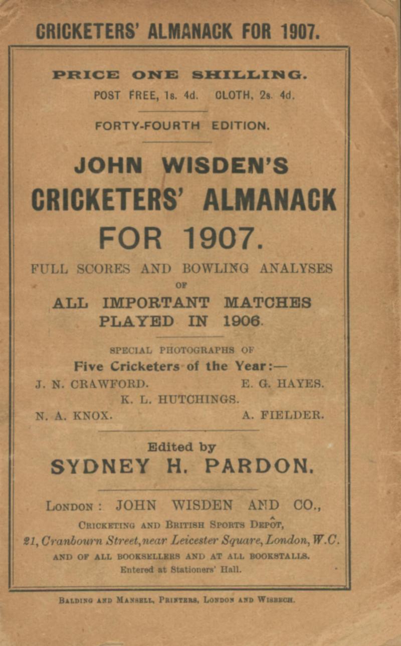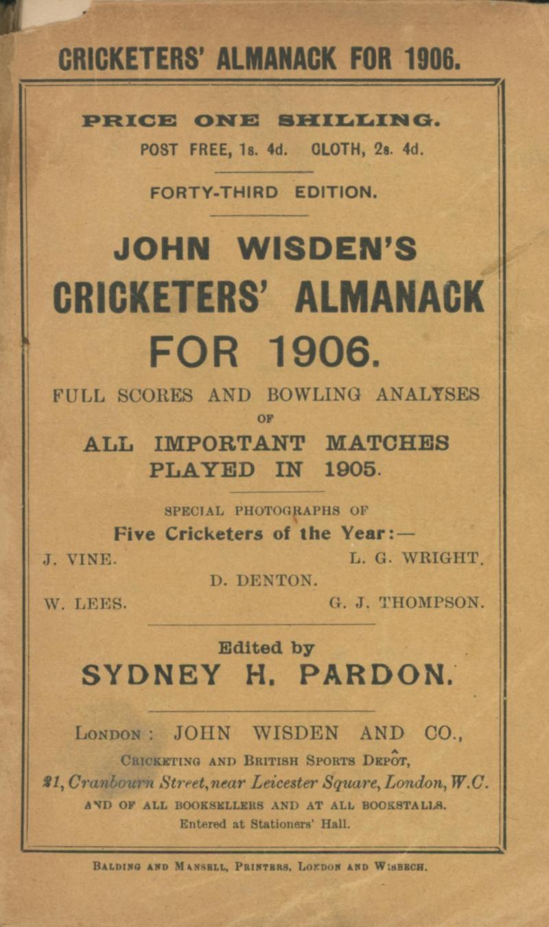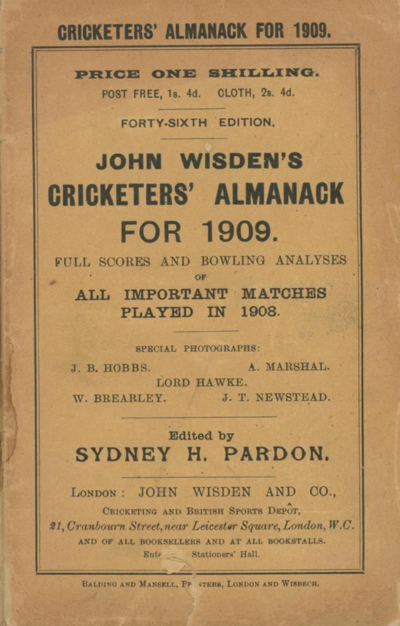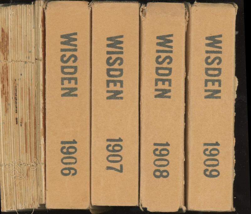 Wisden Cricketers Almanack for 1905-1909, all with original wrappers, spines damaged, Fair condition.