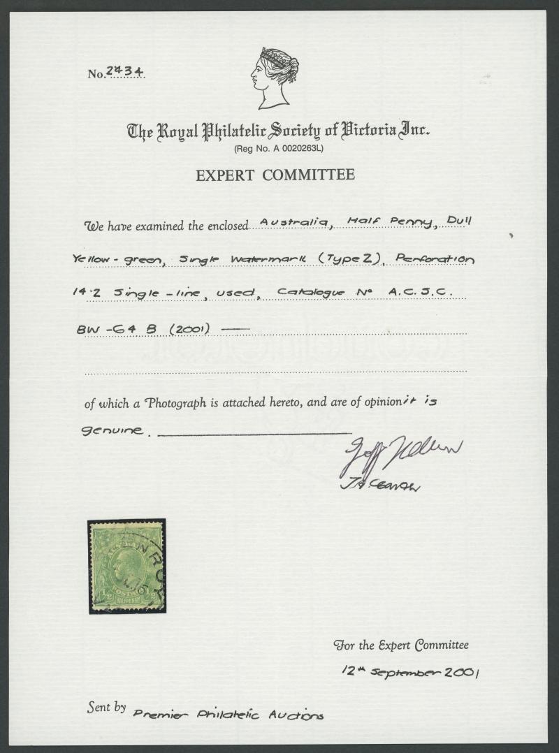 3L37] ACSC 64m, neat Sydney machine cancel with bars just clear of the variety, Cat $1500. Australian Commonwealth Specialist Society of Great Britain Certificate (1962 !). Ex David Adams. (Image1) (Image2)