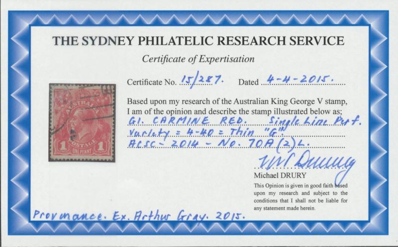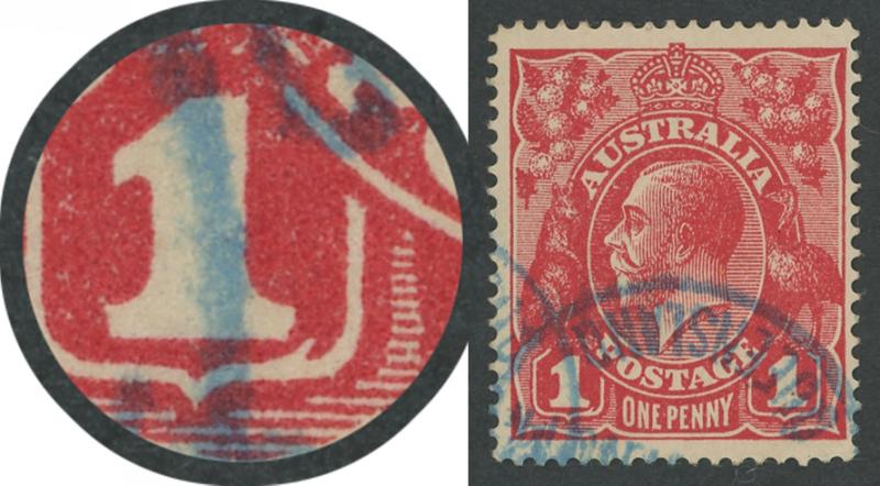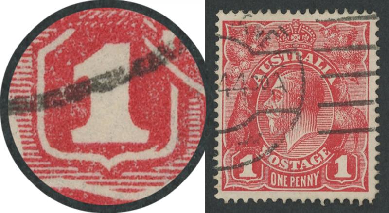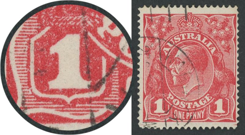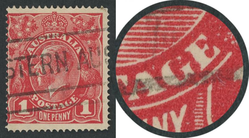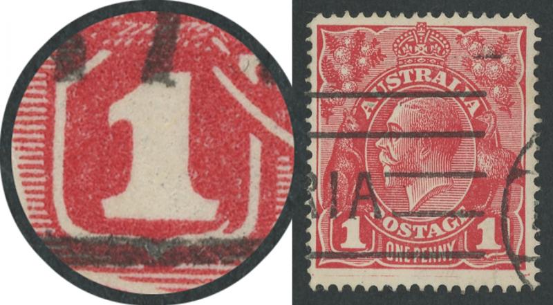 1d carmine-red Single-Line Perf SG 21 with Thin 'G' Retouch [Pos IV/40] ACSC 70(2)l, WA machine cancel clear of the variety, Cat