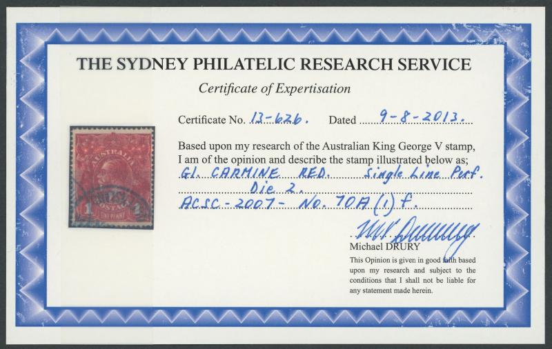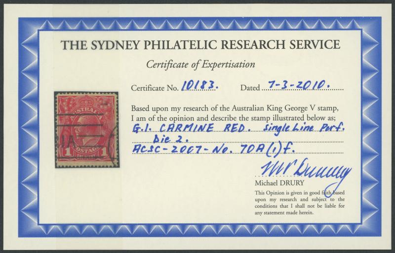 1d carmine-red Single-Line Perf Die II ACSC 70(1)i (SG 21a), well-centred, Melbourne 1914 machine cancel well clear of the Die II