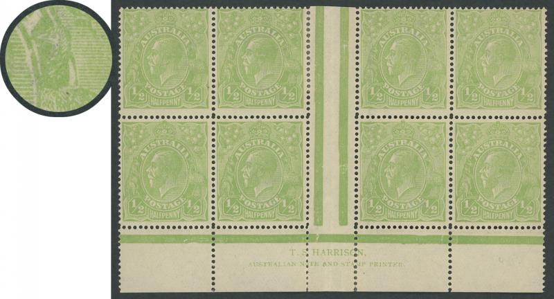 ½d green SG 20 Electro 6 TS Harrison One-Line Imprint block of 4 with Retouch to Crack through King's Ear [Pos 6L54] and Eight