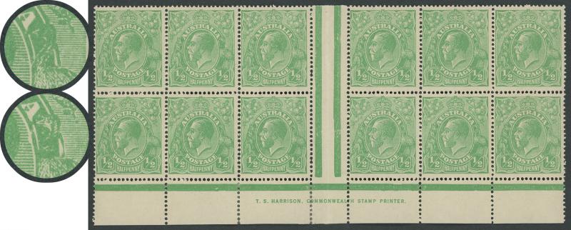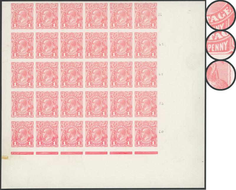 'Y') [IV/41], and Large Colour Flaw outside Right Frame opposite Emu which was partially corrected before printing [Pos IV/46], a few very minor blemishes, Cat $18,750+ for singles. An important piece: the ACSC states that "probably one sheet was