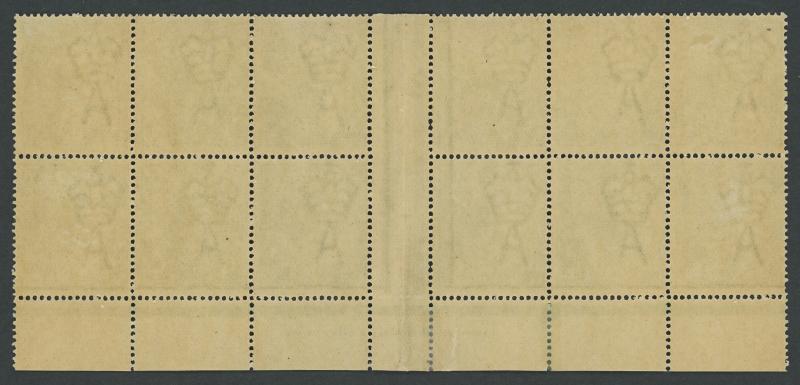 Wattles at Right [Pos 6R49] ACSC 63(6)z in a block of 12 (6x2), the two upper-left units with Retouched 'Headless' Emu [Pos 6L52] and Retouched 'Neckless' Emu [Pos 6L53] ACSC 63(6)h & i, very minor perf reinforcing in the lower margin only, a couple