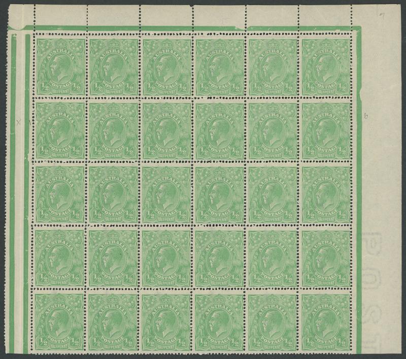 30 (6x5) from Pane IV with 'Jubilee Lines' below the lower six units, enormous margins at right & at base and virtually complete gutter at left, with Thin 'G' of 'POSTAGE' [IV/40], a very early state of Small White Dot on 'Y' of 'PENNY' (Pregnant