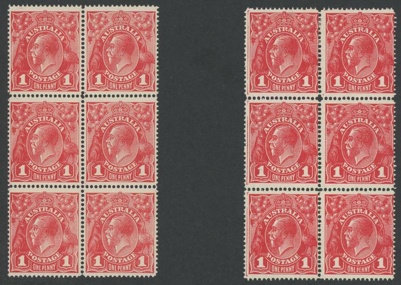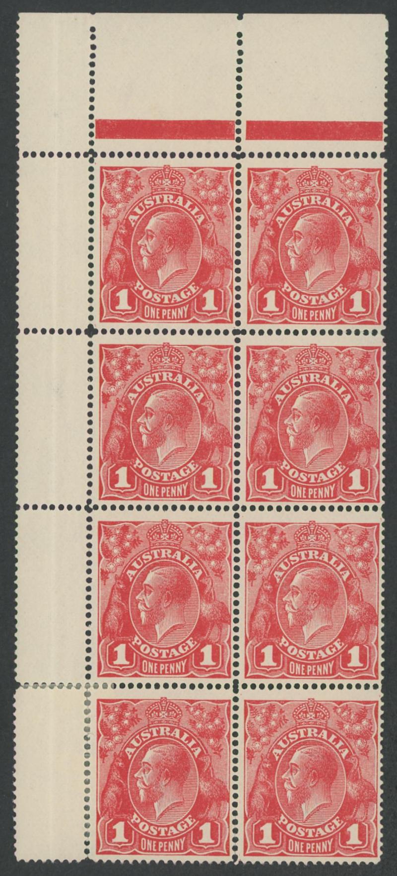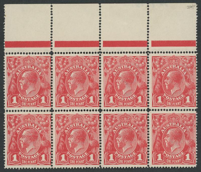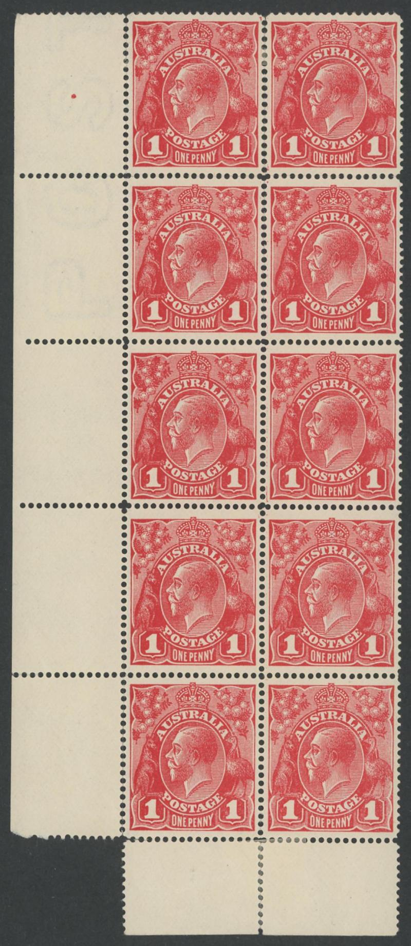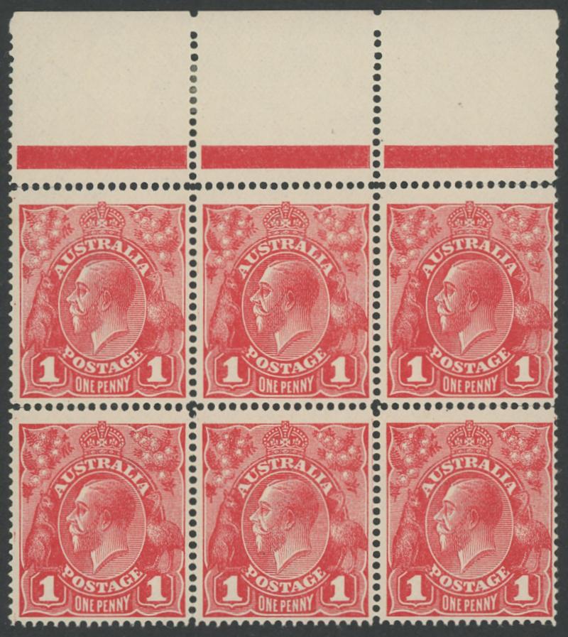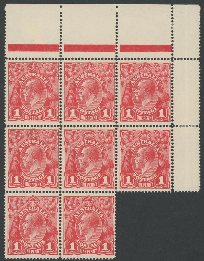 1d carmine-red Single-Line Perf ACSC 70 (SG 21) group of mint multiples comprising marginal block of 12 (6x2; some spotting on