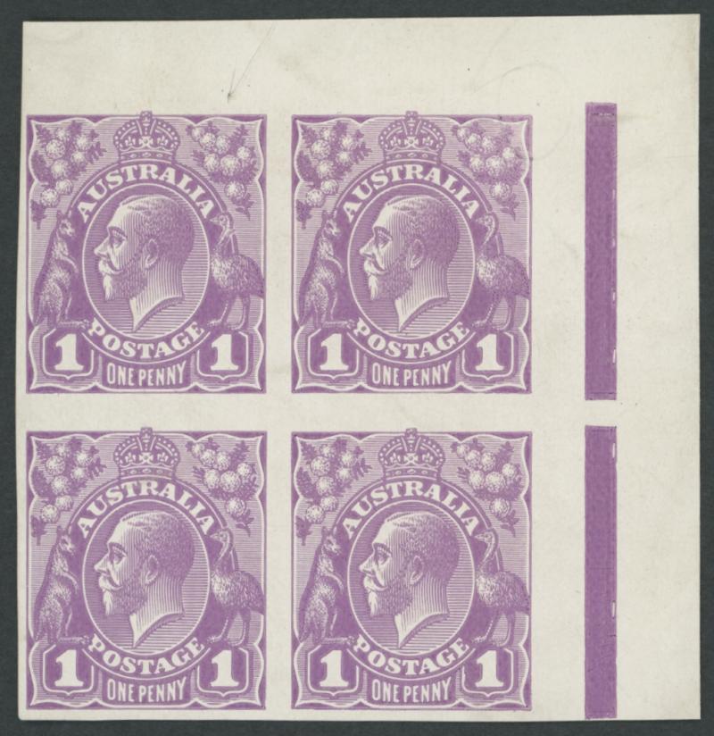 for the imprint block of 4 plus a premium for the shade. Ex Arthur Gray - sold at our auction of 30.10.2015 for $2380 (Sale 207 Lot 73) - and Gerald Fon. (Image1) (Image2)