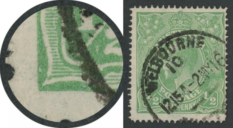 ½d emerald Single-Line Perf ACSC 64A (SG 20a) with unlisted minor variety White Dot in Lower-Left Frame [Pos 3R33], Melbourne cds
