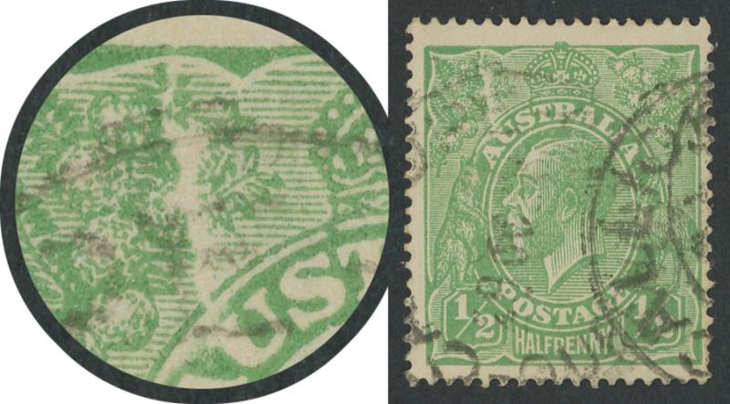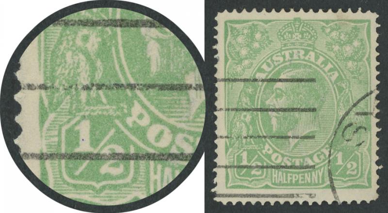 ½d pale green Single-Line Perf SG 20a with Coloured Flaw on Kangaroo's Belly and additionally with Thinned Lower Left Frame [Pos