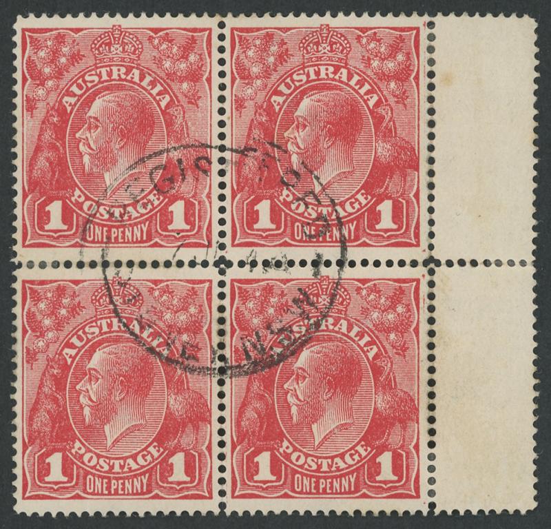 1d carmine-red Single Line Perf ACSC 70 (SG 21) marginal block of 4 from the right-hand side of the sheet, well-centred, somewhat