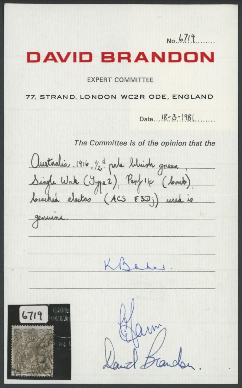 (Qld) cds cancels of '29OC18' largely clear of the variety, Cat $6000 (£4000+ for early state). David Brandon Certificate (1981). The crack passes through the 'U' of 'AUSTRALIA' into the Kangaroo. Ex David Adams. Andrew Johnston's example with corner