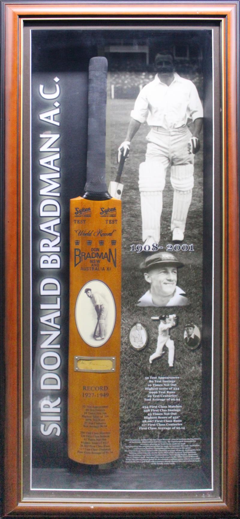 Sir Donald Bradman 'Sir Donald Bradman AC' display comprising signature on-piece affixed to replica 'Sykes - Don Bradman' cricket