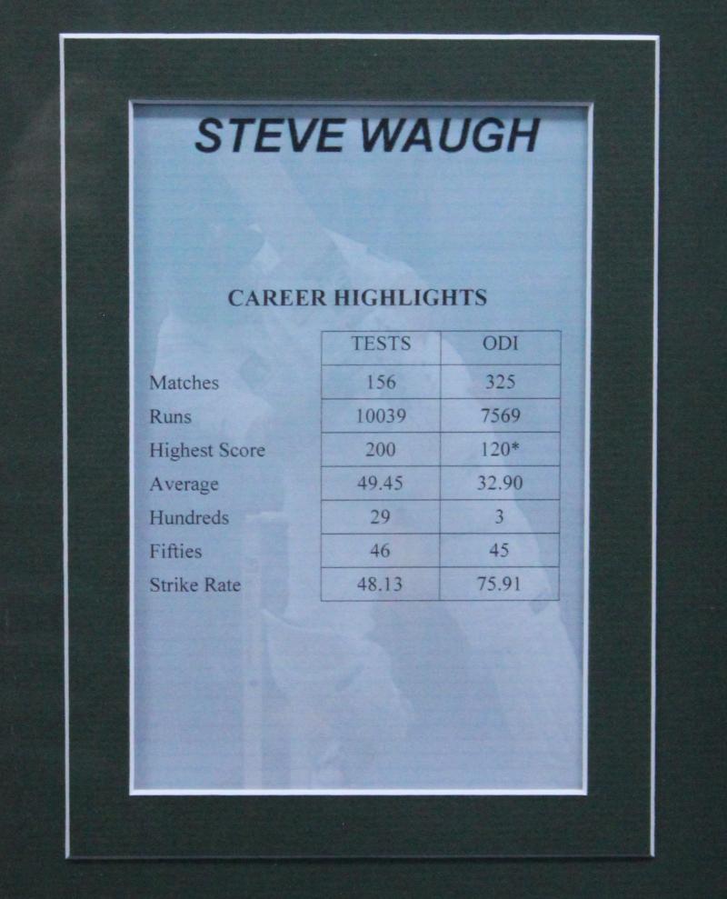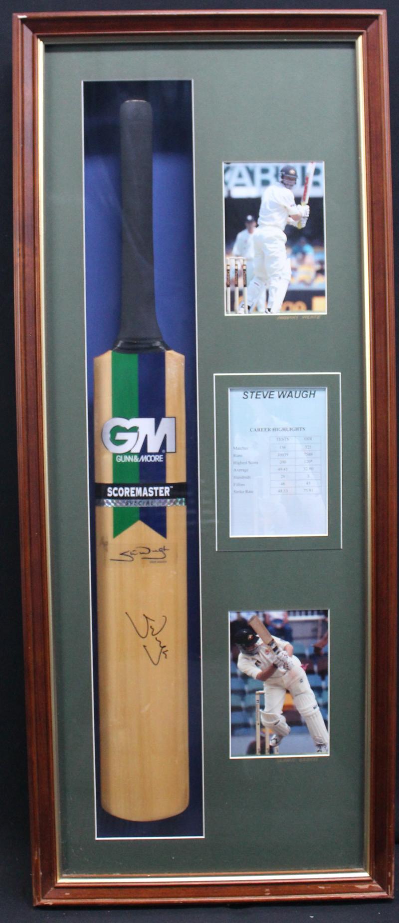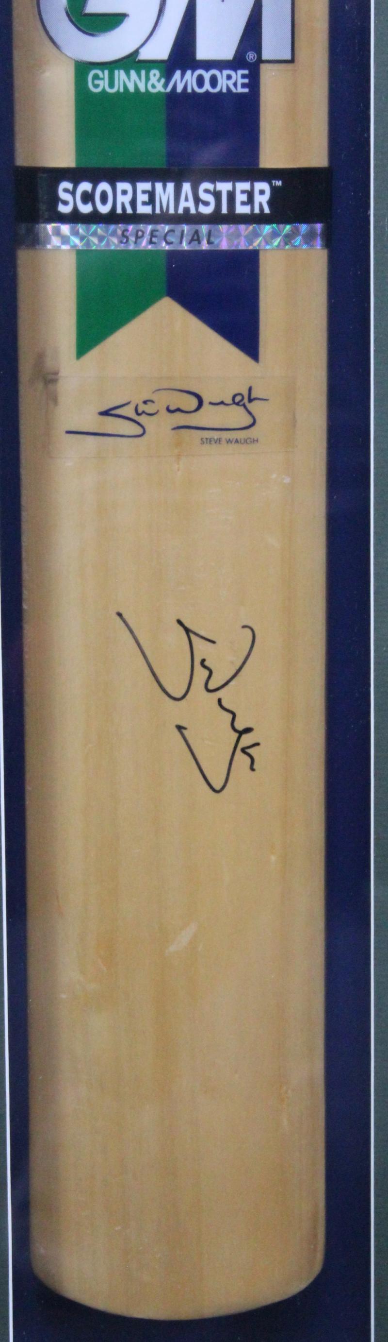 Steve Waugh 'Gunn & Moore - Scoremaster' cricket bat signed on front by Steve Waugh, mounted in attractive display case with two