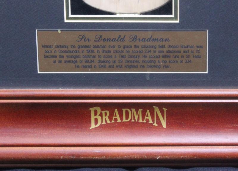 Sir Donald Bradman 'Sir Donald Bradman' display comprising signature on cricket card affixed to replica 'Sykes - Don Bradman'