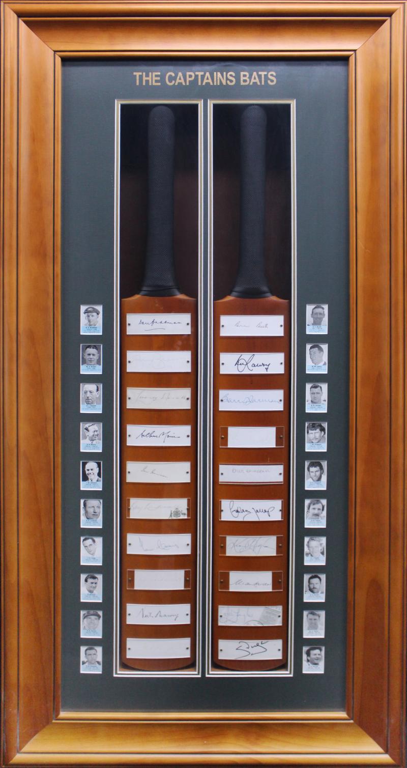 'The Captains Bats' pair of bats with 20 signatures affixed - Don Bradman, Bill Brown, Lindsay Hassett, Arthur Morris, Ian Johnson,