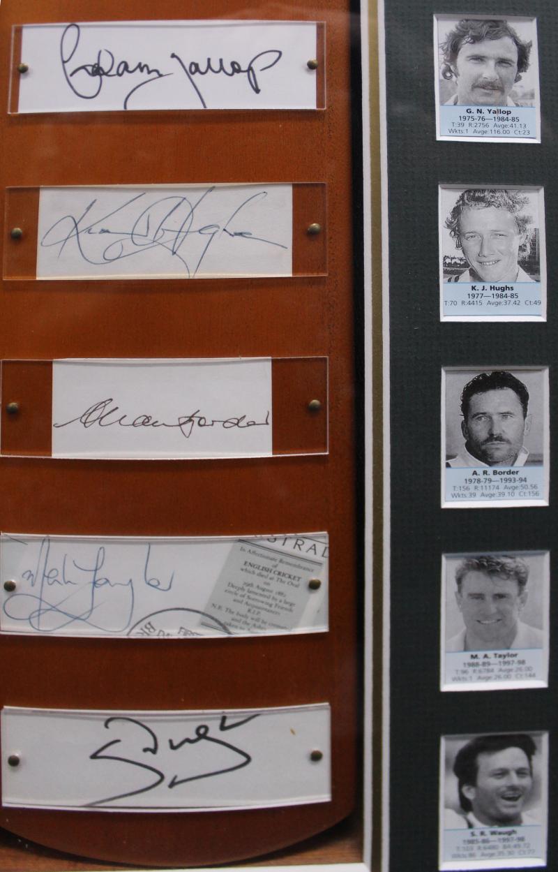 Ray Lindwall, Ian Craig, Richie Benaud, Neil Harvey, Bob Simpson, Brian Booth, Bill Lawry, Barry Jarman, Ian Chappell, Greg Chappell, Graham Yallop, Kim Hughes, Allan Border, Mark Taylor & Steve Waugh (few signatures fading), in attractive display